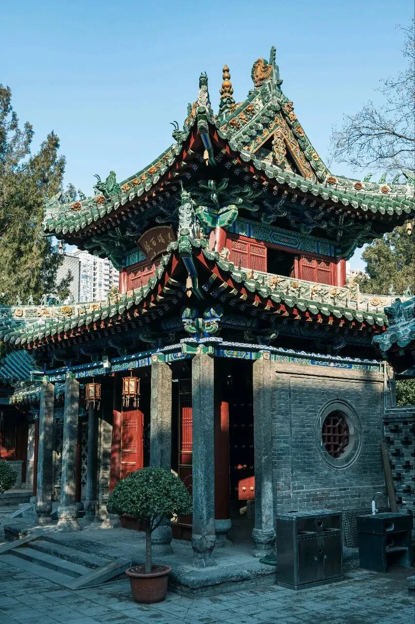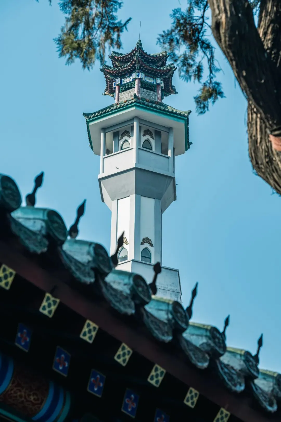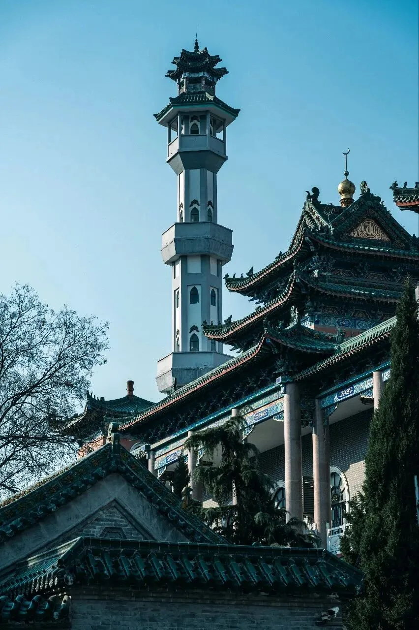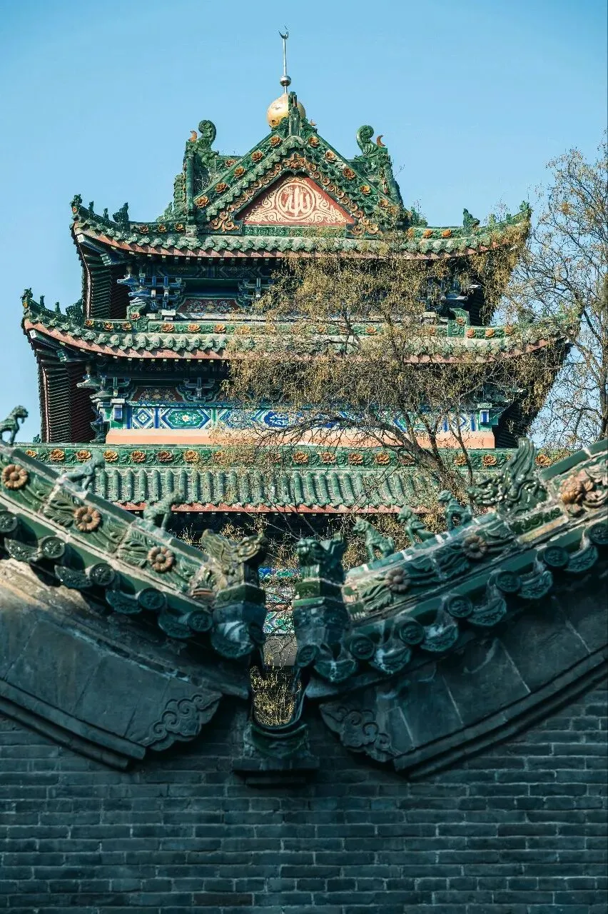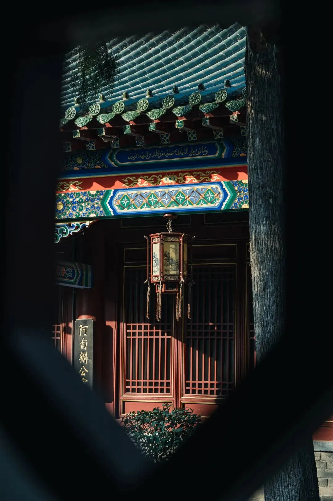 建筑奇观:颠覆对清真寺的固有印象!整体是中国传统宫殿式两进四合院,飞檐翘角、黄绿琉璃瓦尽显中式古韵,却暗藏伊斯兰巧思 —— 望月楼的汉阿双语石柱、大殿的新月标识、阿拉伯经文与中式雕花窗共存,罕见的 “勾连搭” 结构(三殿相连无外露梁柱)堪称建筑界孤例。