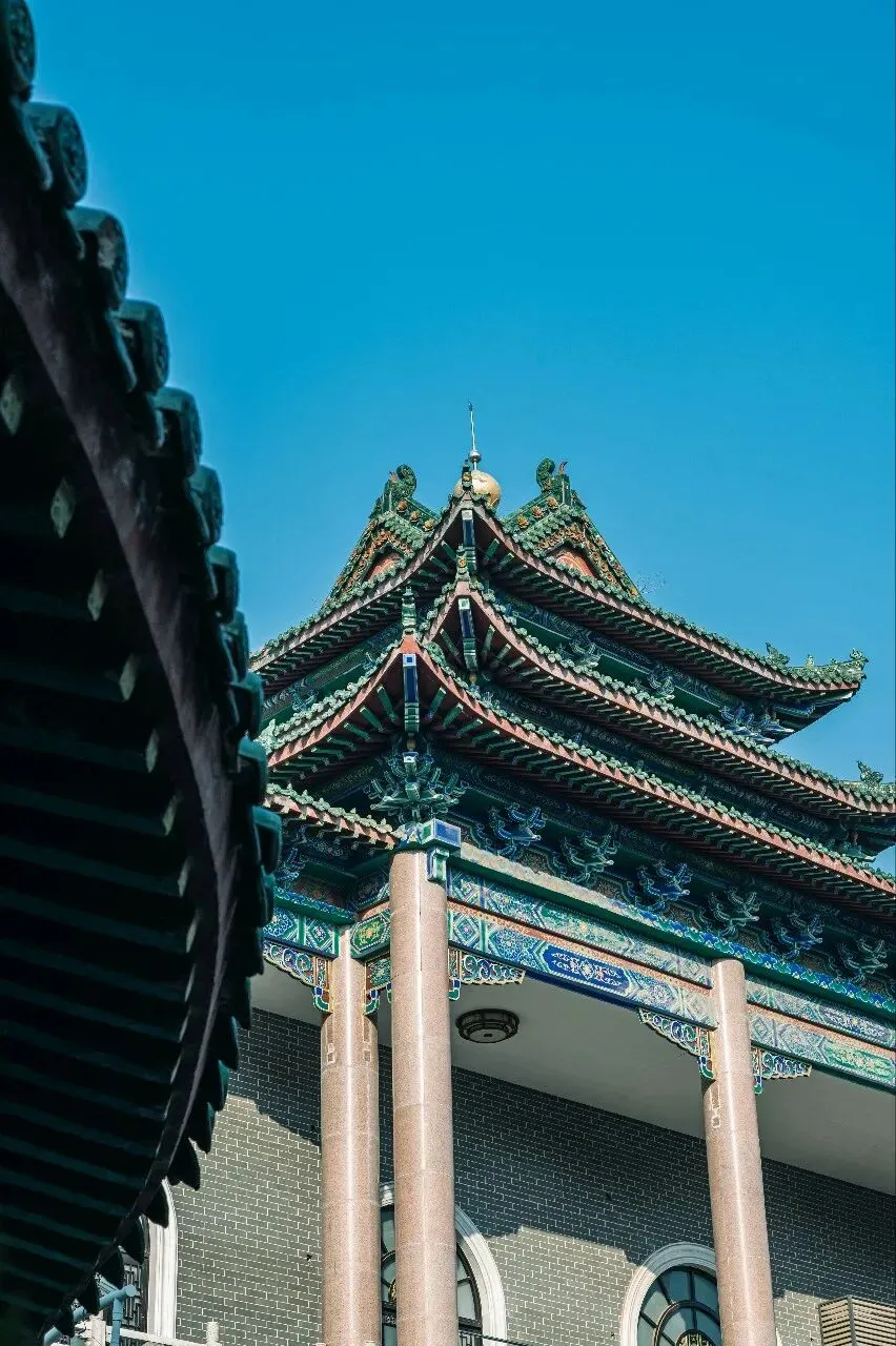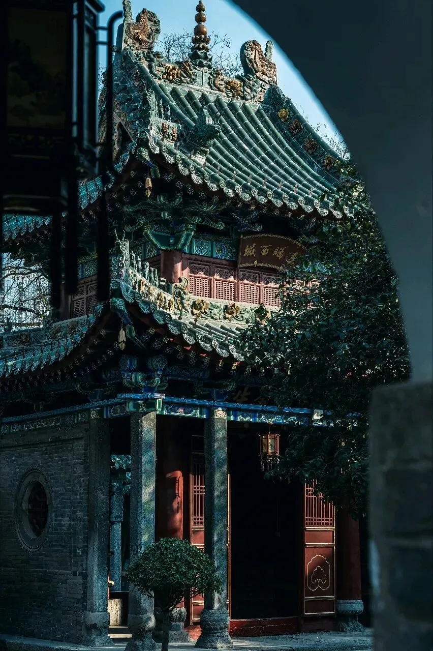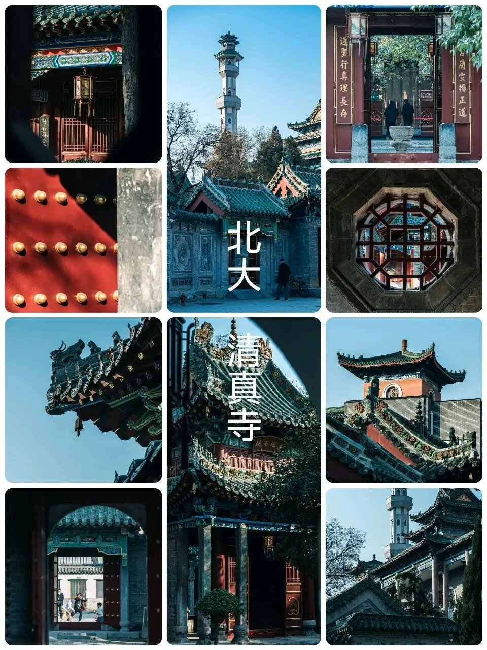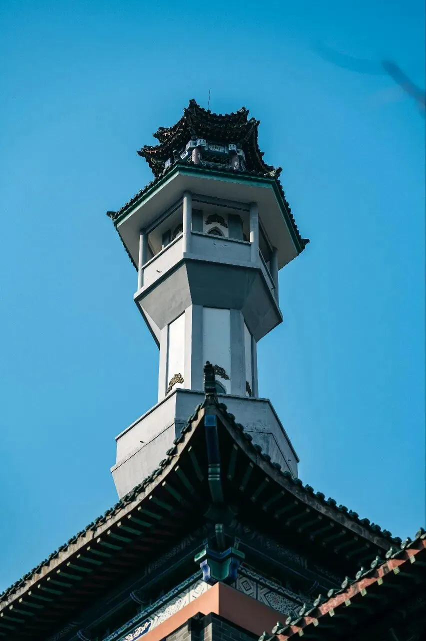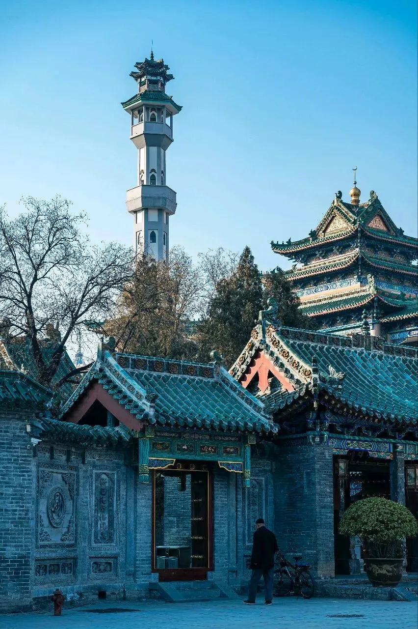 建筑奇观:颠覆对清真寺的固有印象!整体是中国传统宫殿式两进四合院,飞檐翘角、黄绿琉璃瓦尽显中式古韵,却暗藏伊斯兰巧思 —— 望月楼的汉阿双语石柱、大殿的新月标识、阿拉伯经文与中式雕花窗共存,罕见的 “勾连搭” 结构(三殿相连无外露梁柱)堪称建筑界孤例。