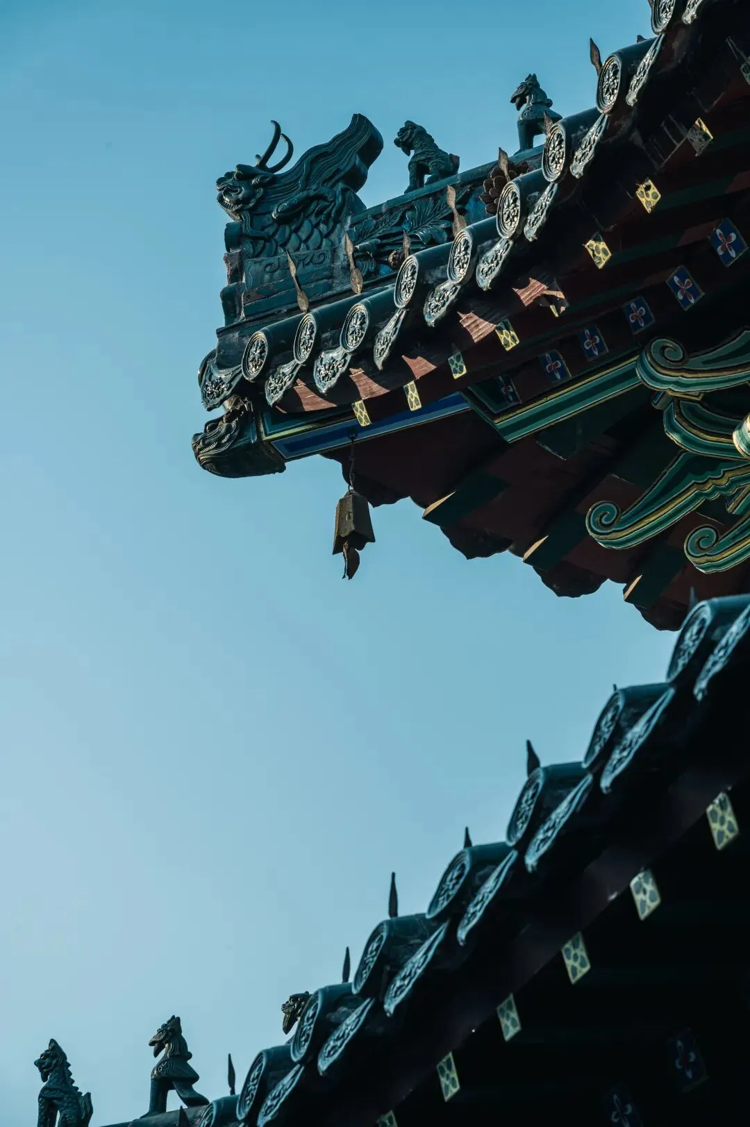 望月楼前仰拍:飞檐 + 琉璃瓦 ,古风氛围感拉满
