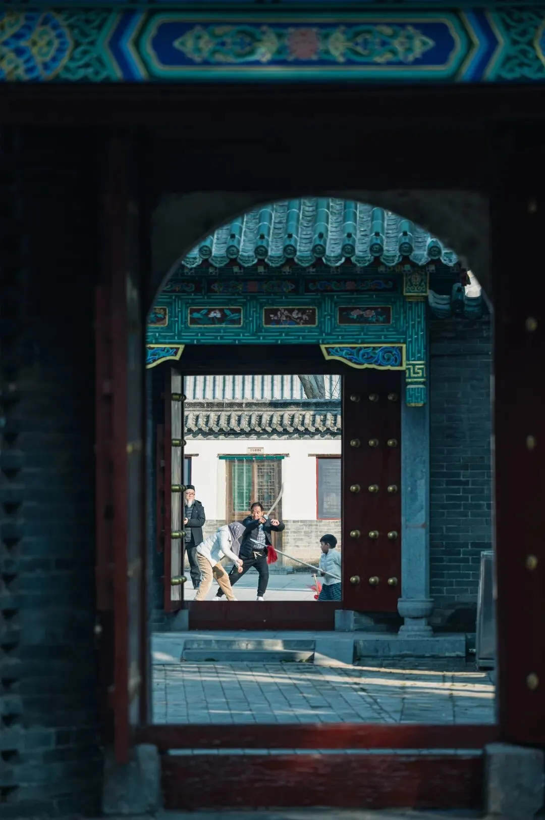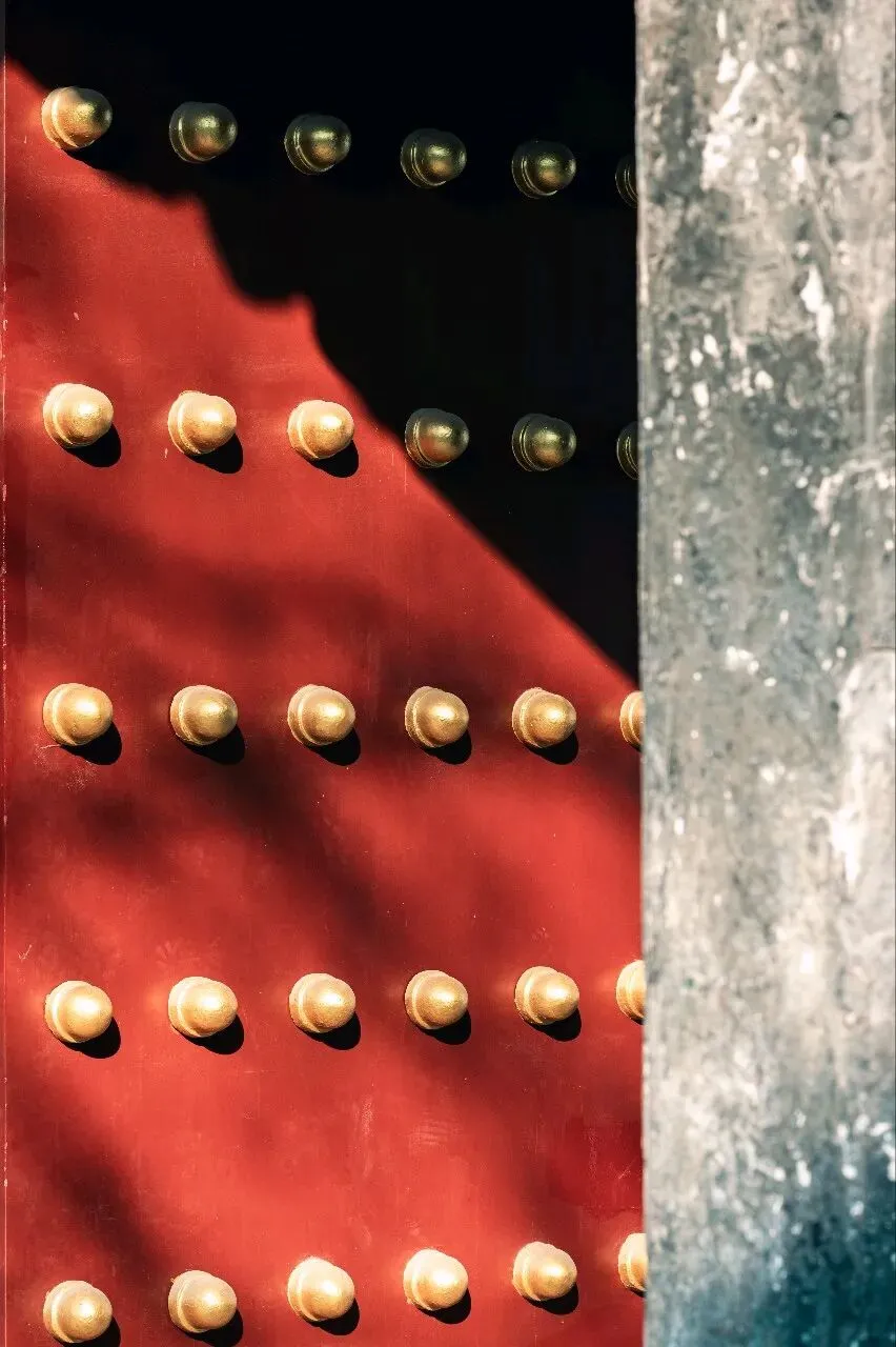 红色大门:光影打在红门上,仿佛在身在宫廷大院。
