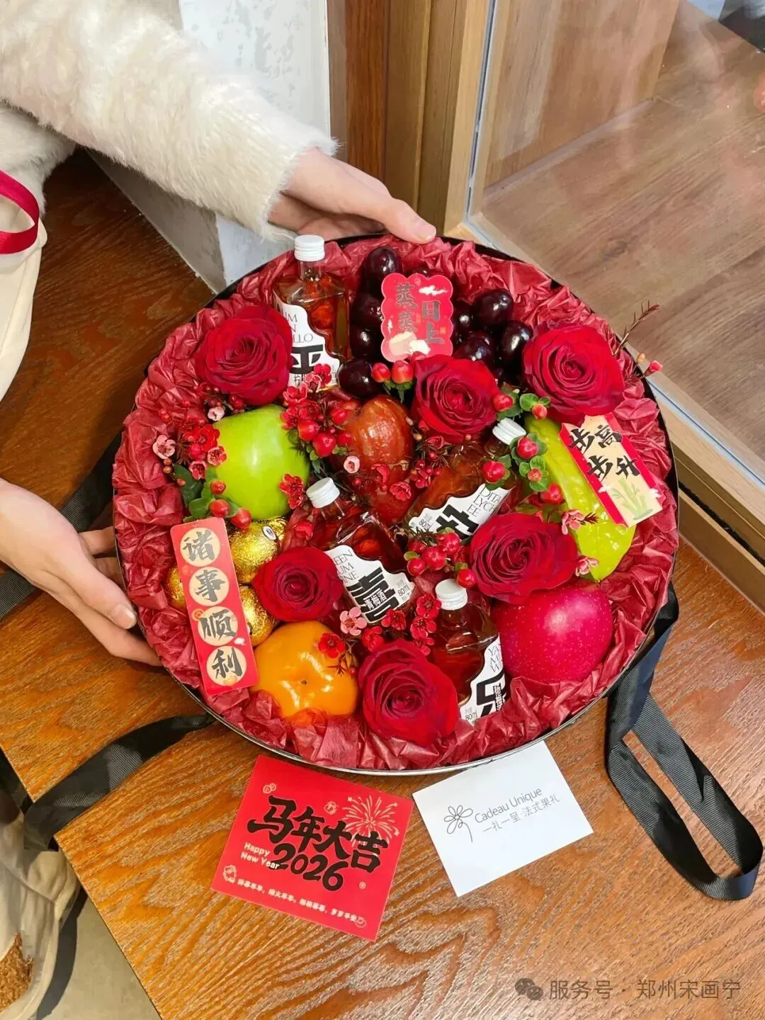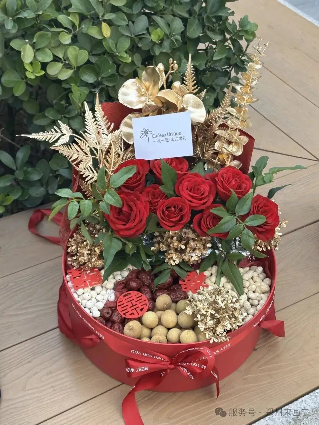 正红圆盒满载红橙花束与象征圆满的鲜果