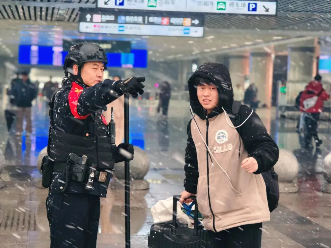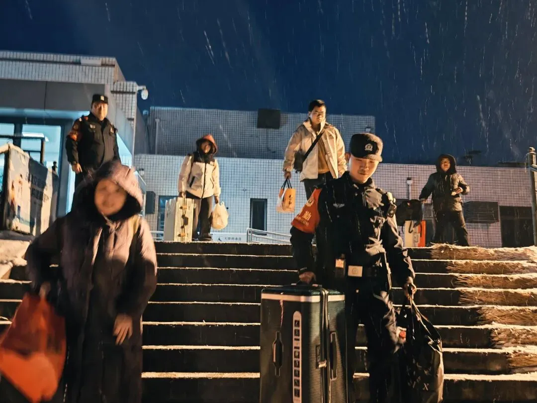 故事:风雪夜归时,民警主动帮旅客搬运行李,在湿滑的台阶上,用行动温暖旅客回家路。