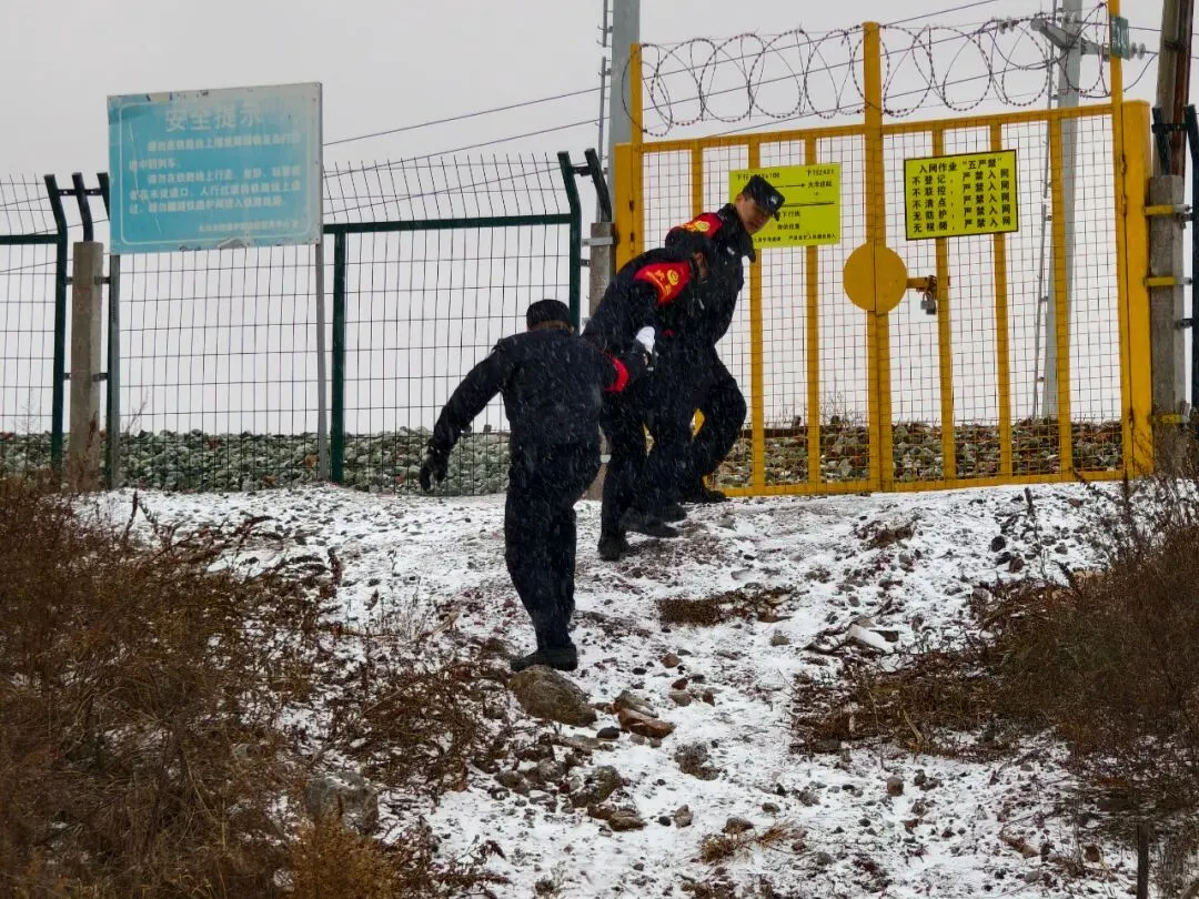 故事:雪后巡线,民警们携手互助,在覆雪的土坡上稳步前行。这一画面定格了铁路民警坚守岗位、共护线路安全的责任与默契,也尽显风雪中的担当与温情。