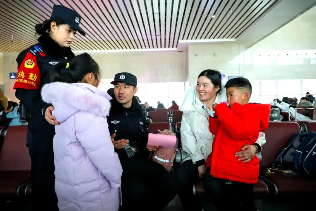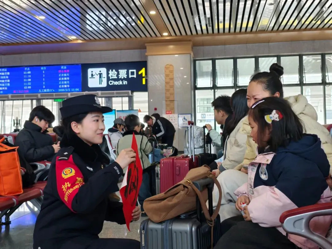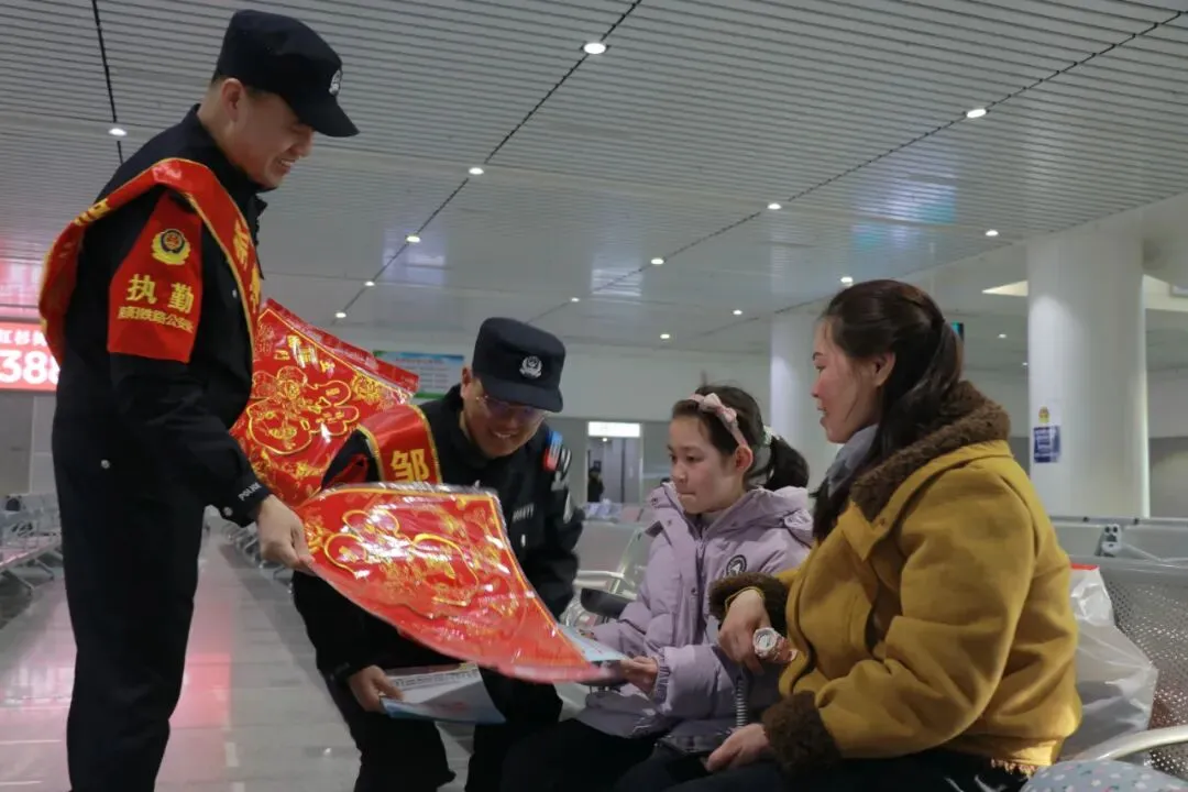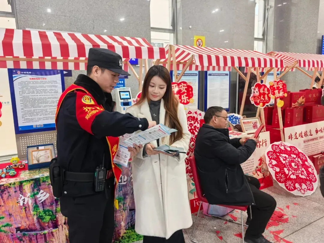 故事:洛阳龙门站派出所民警在候车室开展安全宣传与暖心服务,为旅客讲解出行安全知识、送上新春福字,用温情守护春运归途。