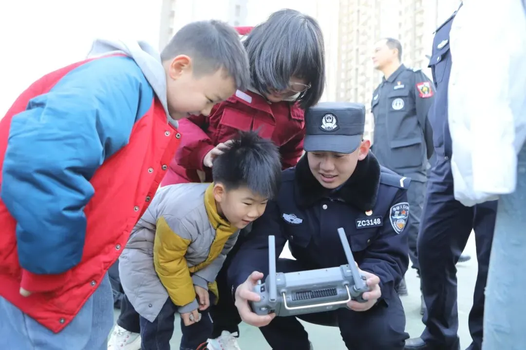 故事:警营开放日活动现场,民警向人民群众展示警用无人机操作,萌娃围拢围观,在互动科普中感受科技魅力,拉近警民距离。