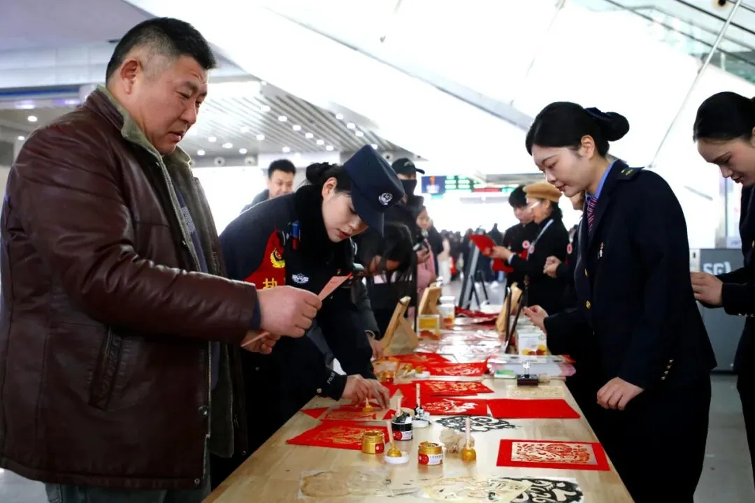 故事:民警联合车站乘务员开展新春送福活动,现场书写春联、裁剪窗花,将浓浓年味和暖心服务送到旅客手中,让春运归途充满温情。