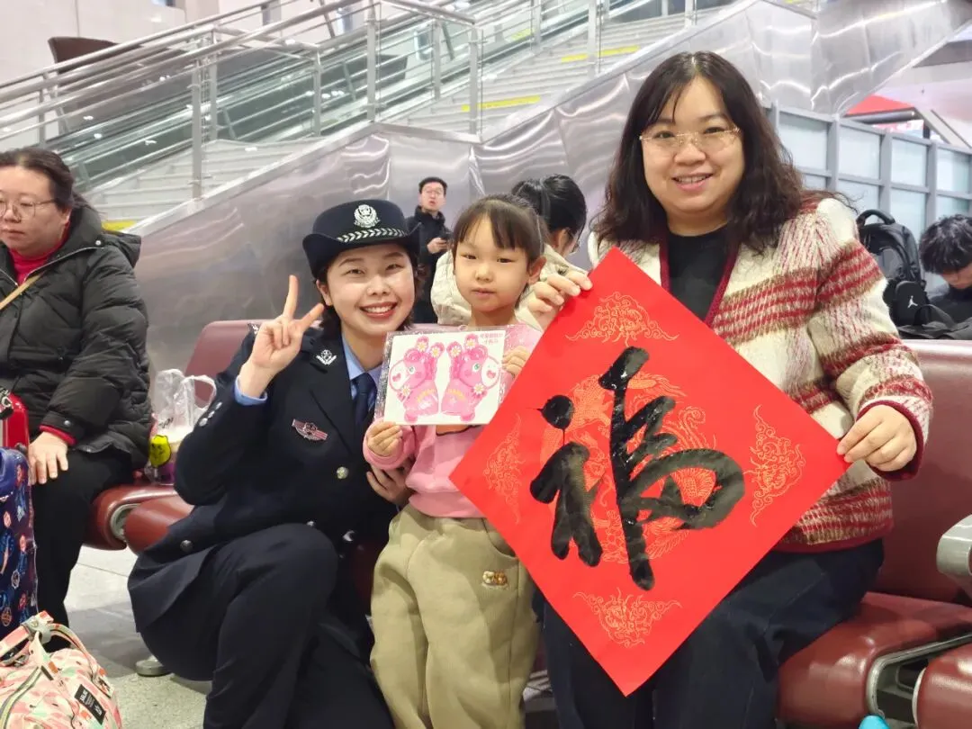 故事:鹤壁东站派出所与当地书法家协会在候车室开展写福字、送祝福活动。民警将 “福”字送给带着孩子回家走亲的旅客。民警叮嘱带孩子出行的安全事项,也祝福旅客新年“好”福气。