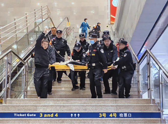 故事:洛阳龙门站派出所民警与工作人员合力抬着担架快步下行,一场争分夺秒的生命救援正在接力上演,每一步都饱含着对生命的敬畏与守护。