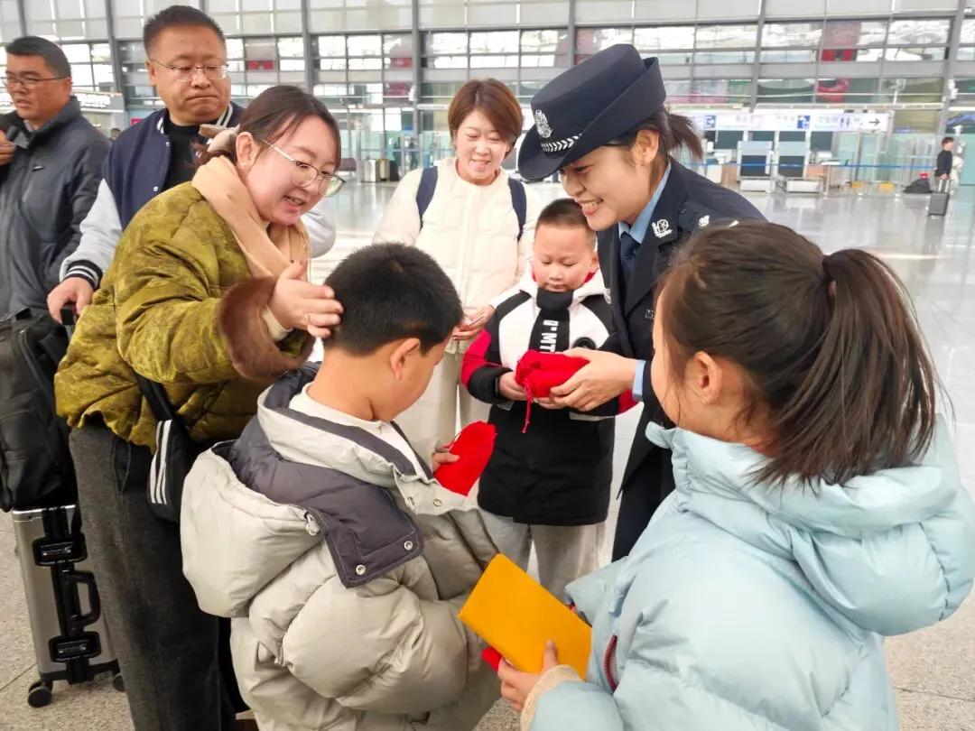 故事:许昌东站派出所民警在候车厅开展爱民实践活动,将满载平安的福袋送给旅客,用暖心服务拉近警民距离,让平安与祝福伴随每一位旅客踏上归途。