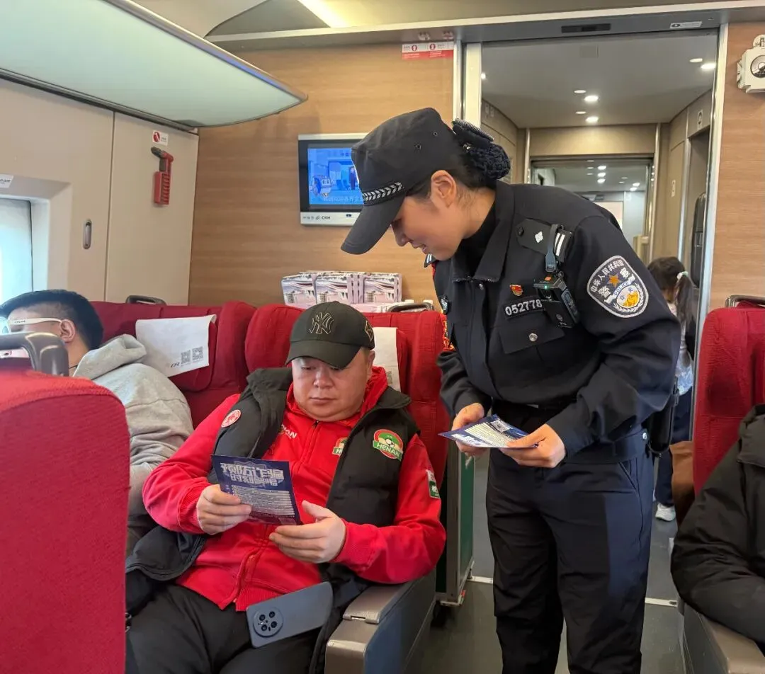 故事:春运期间,旅客流动大,郑州乘警支队执勤乘务二队“枫豫同行”先锋队成员,强化列车宣防,以案释法,保护旅客钱袋子。