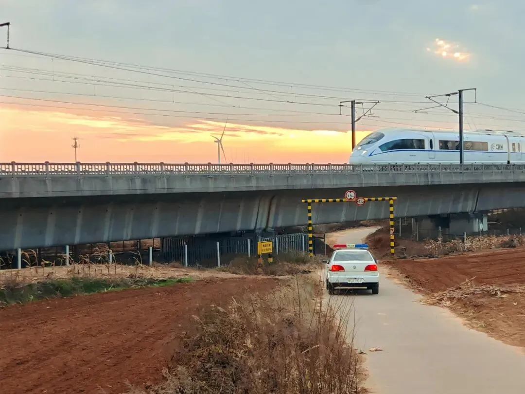 故事:春运期间三门峡南站派出所民警驾车开展线路巡防工作,在晚霞中与高铁交叉而过。