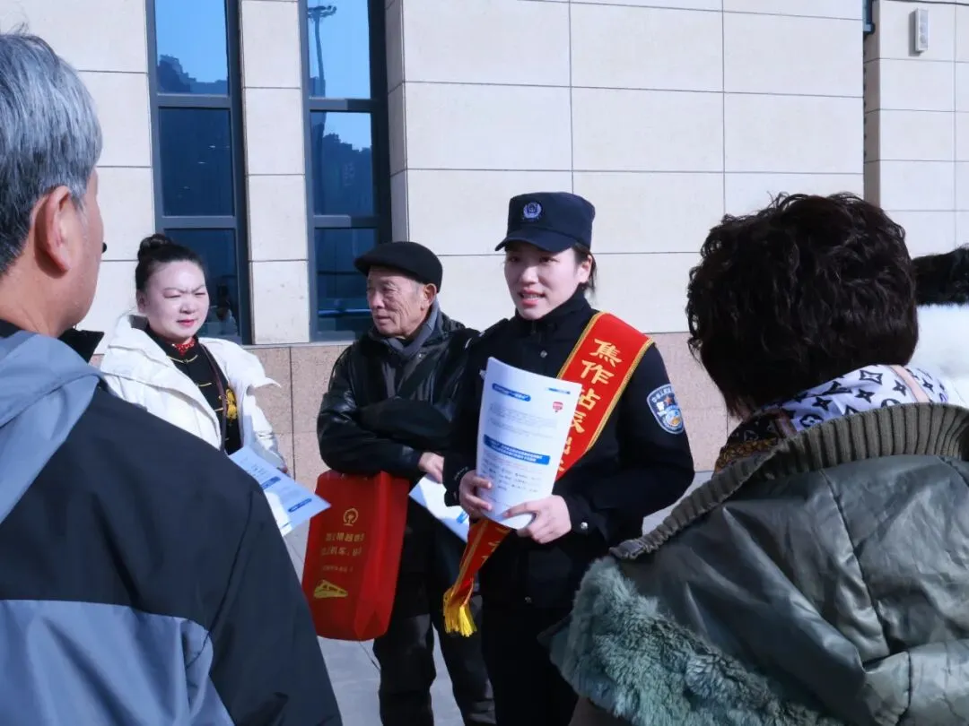 故事:春运期间,焦作站候车室内民警为旅客送上反诈知识锦囊,结合春运高发的购票诈骗、退改签骗局等案例,用通俗易懂的语言帮助旅客提升防骗“免疫力”。
