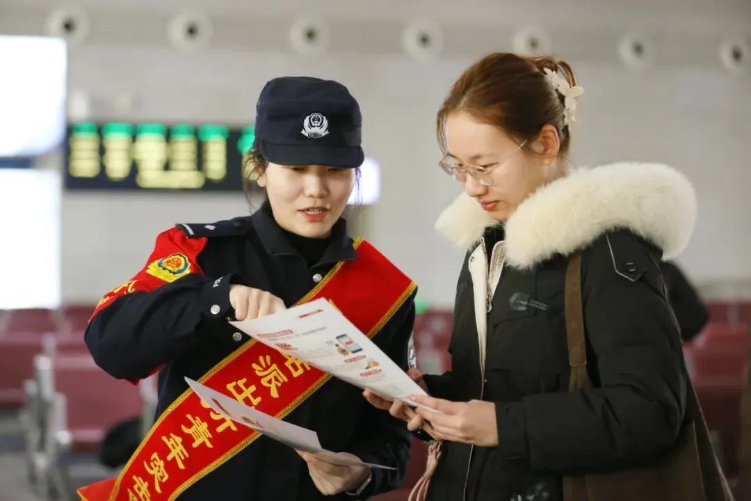 故事:春运期间,在焦作站候车室、进出站口等部位,警花手指宣传单,耐心向旅客讲解当前高发的“诈骗套路”,将反诈知识与旅途场景紧密结合。这场“手把手”的防骗教学,让安全提示变得亲切易懂,为归家旅途增添了坚实的安全保障。
