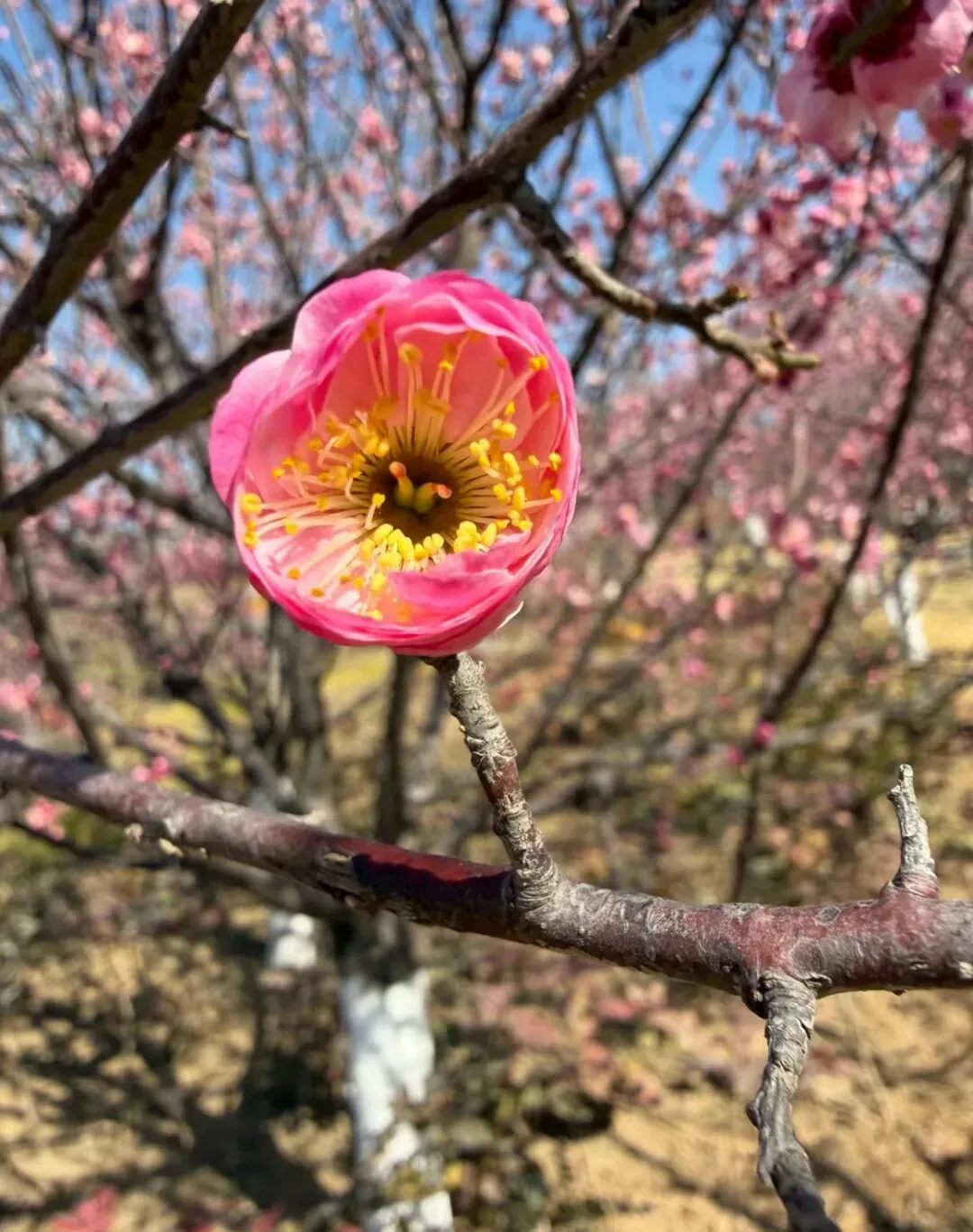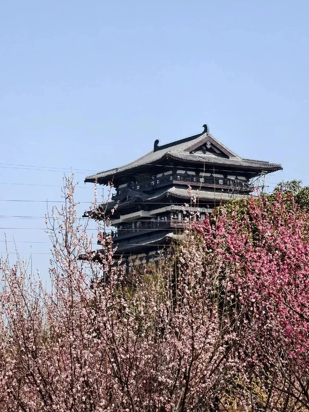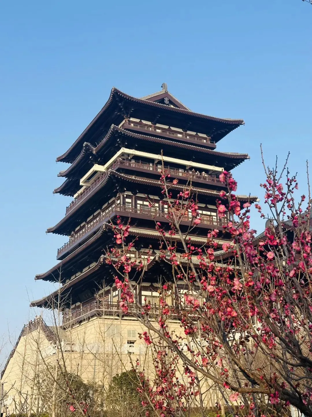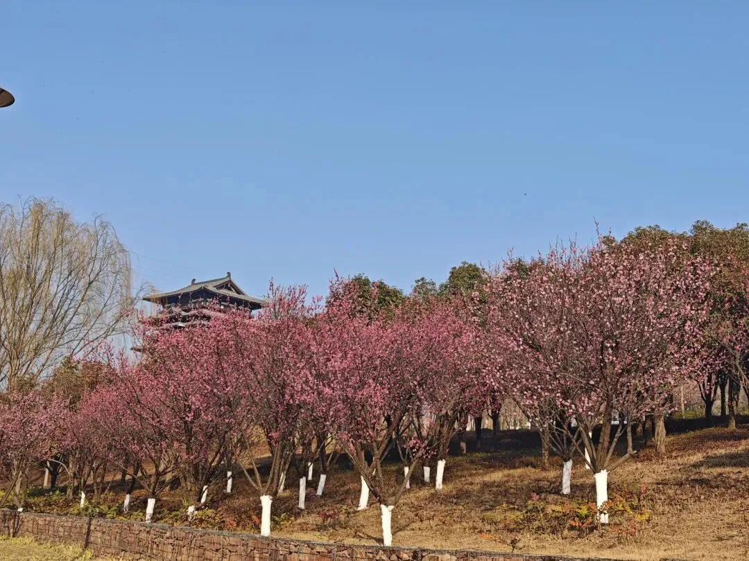 登晴云阁俯瞰,层叠花海与古风楼阁相融相映,远眺心旷神怡,宛若穿越古今。梅林小径间,低角度仰拍花树,或是定格一朵落梅,轻松避开人群,随手一拍就是壁纸级大片。