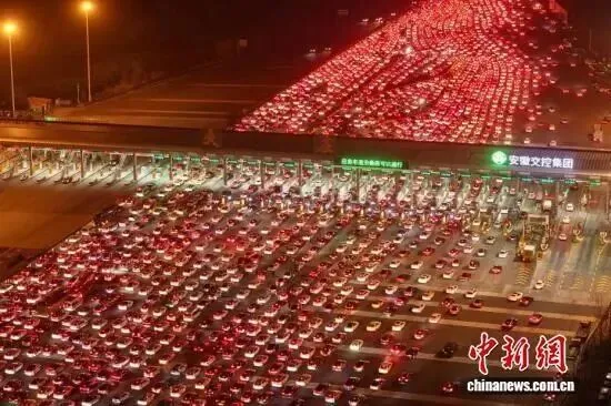 ●震撼!航拍中国最大高速收费站春节返程高峰,位于安徽省全椒县、毗邻皖苏两省交界的吴庄收费站36个车道被挤满,车灯连成“星河”。