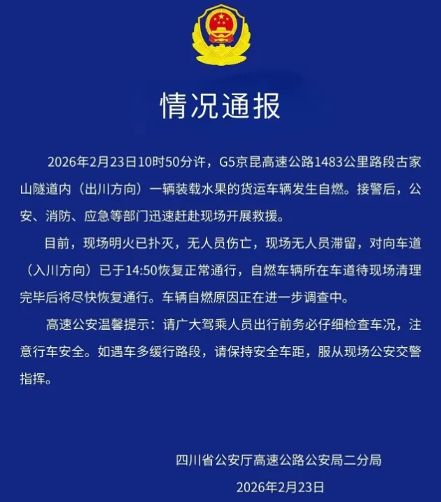 ●四川通报“京昆高速古家山隧道一货车起火”:系装载水果货车自燃,明火已扑灭,无人员伤亡,现场无人员滞留,车辆自燃原因正在调查。