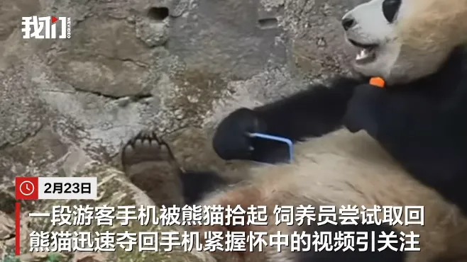 ●2月23日,一段游客手机被熊猫拾起,饲养员尝试取回时,熊猫迅速夺回手机紧握怀中的视频引关注。最后可能是熊猫玩够了才将手机丢在地上,饲养员使用夹子将手机取回还给游客。