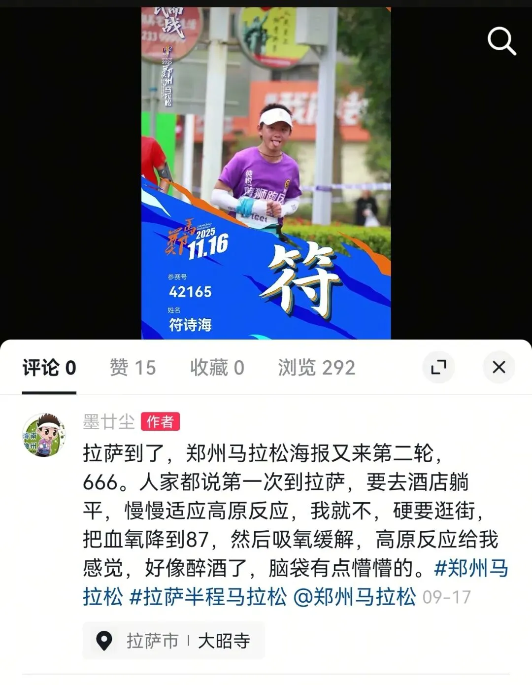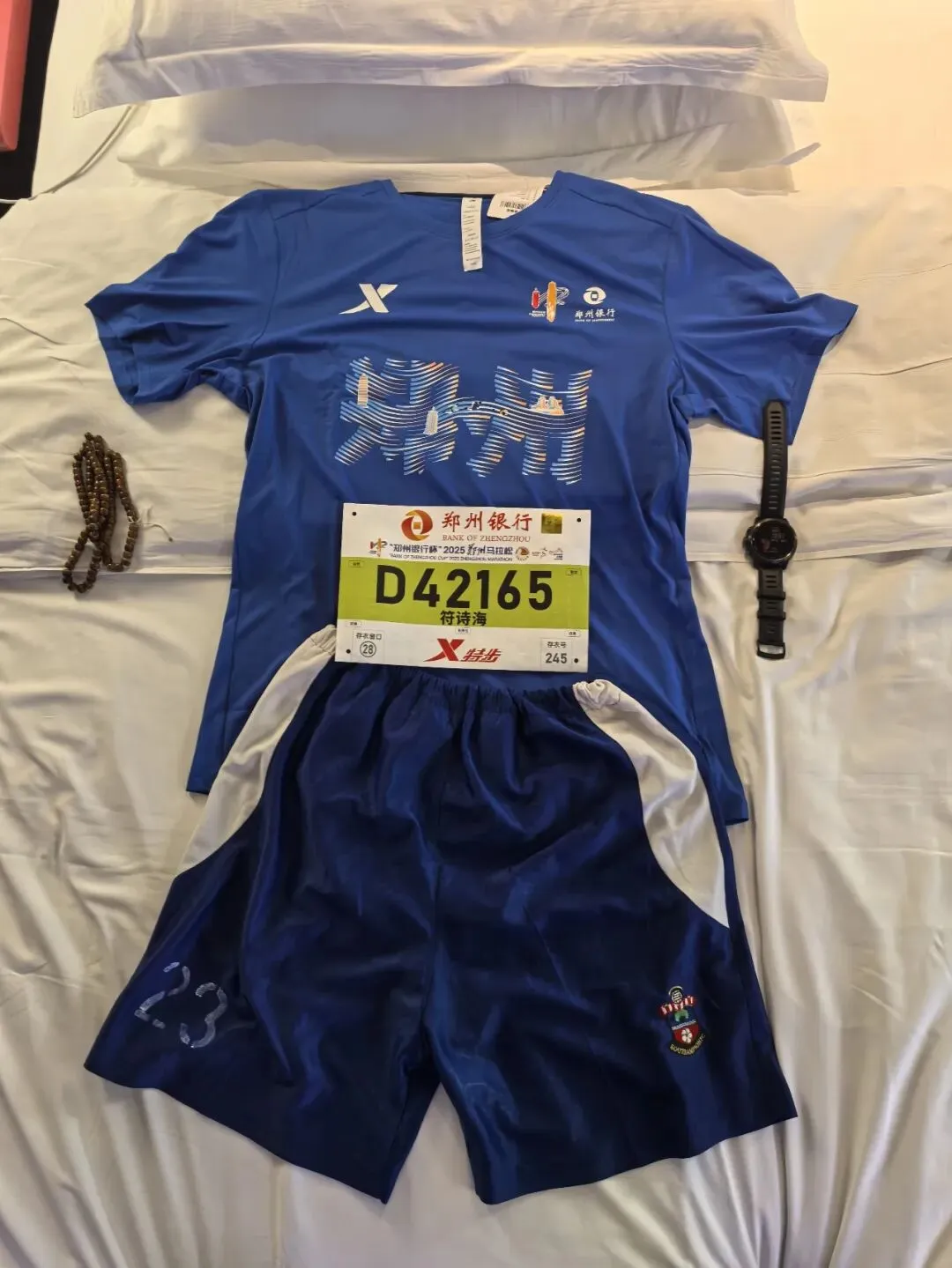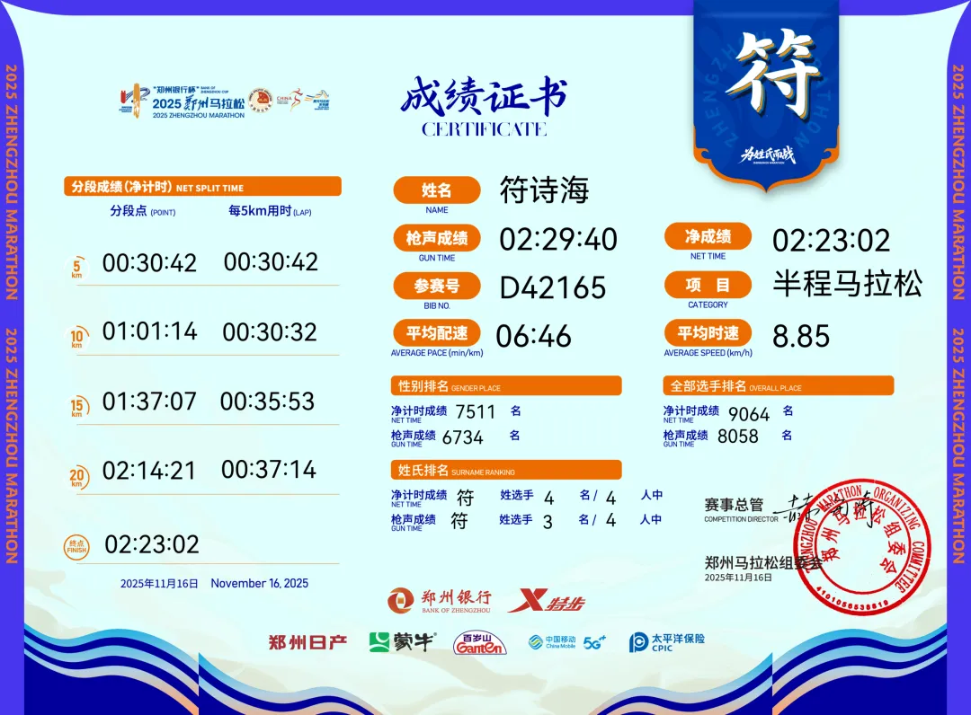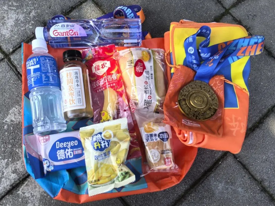 07:30开跑,6分钟才过起点。前10公里正常跑后11公里摆烂。完赛海报说我是符家第三个完赛,跟参赛号海报做拼接,成一个图,拿到奖牌,毛巾,完赛包,再去拿存衣包,坐地铁回酒店休息。