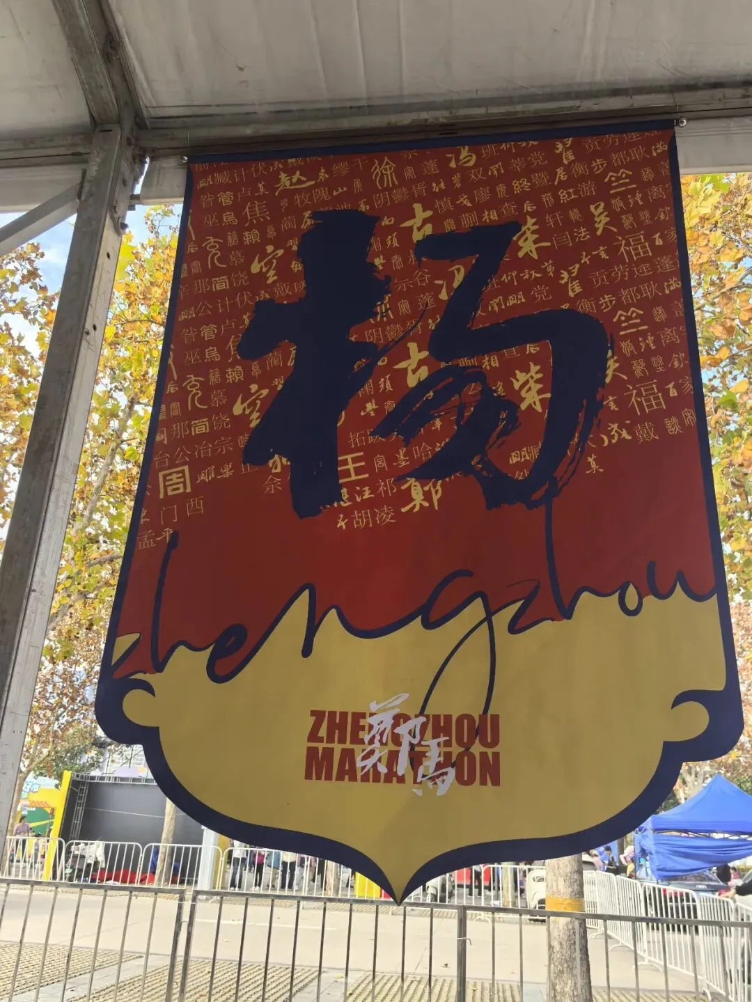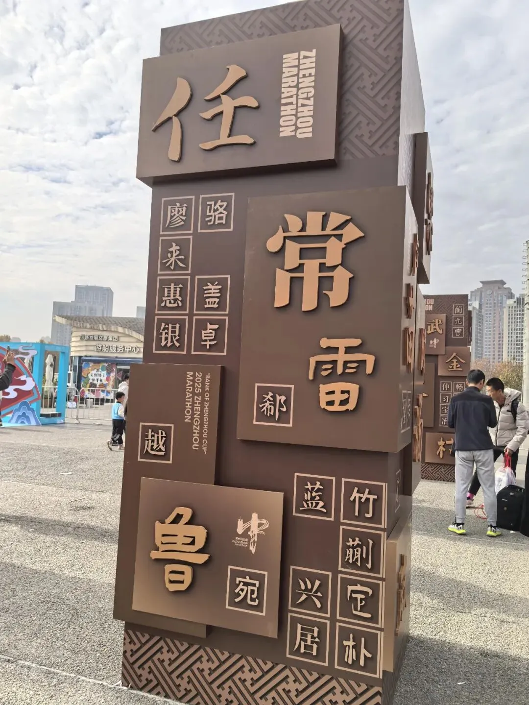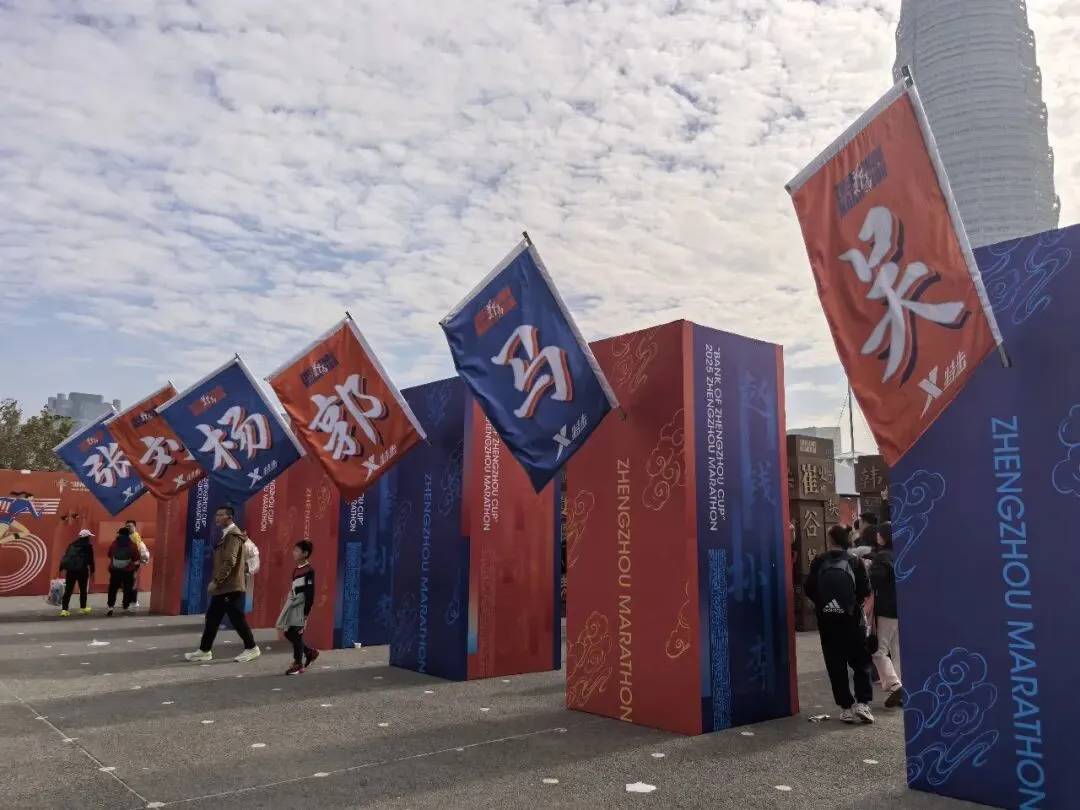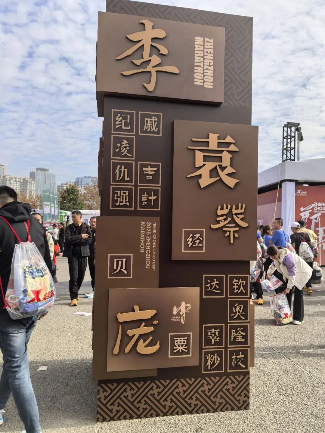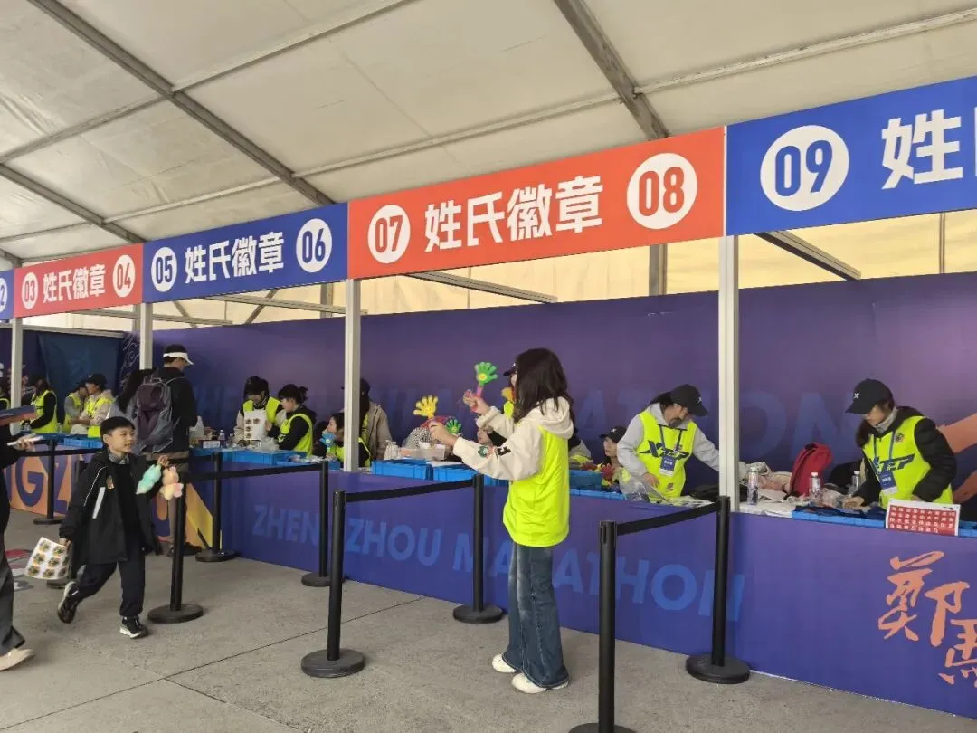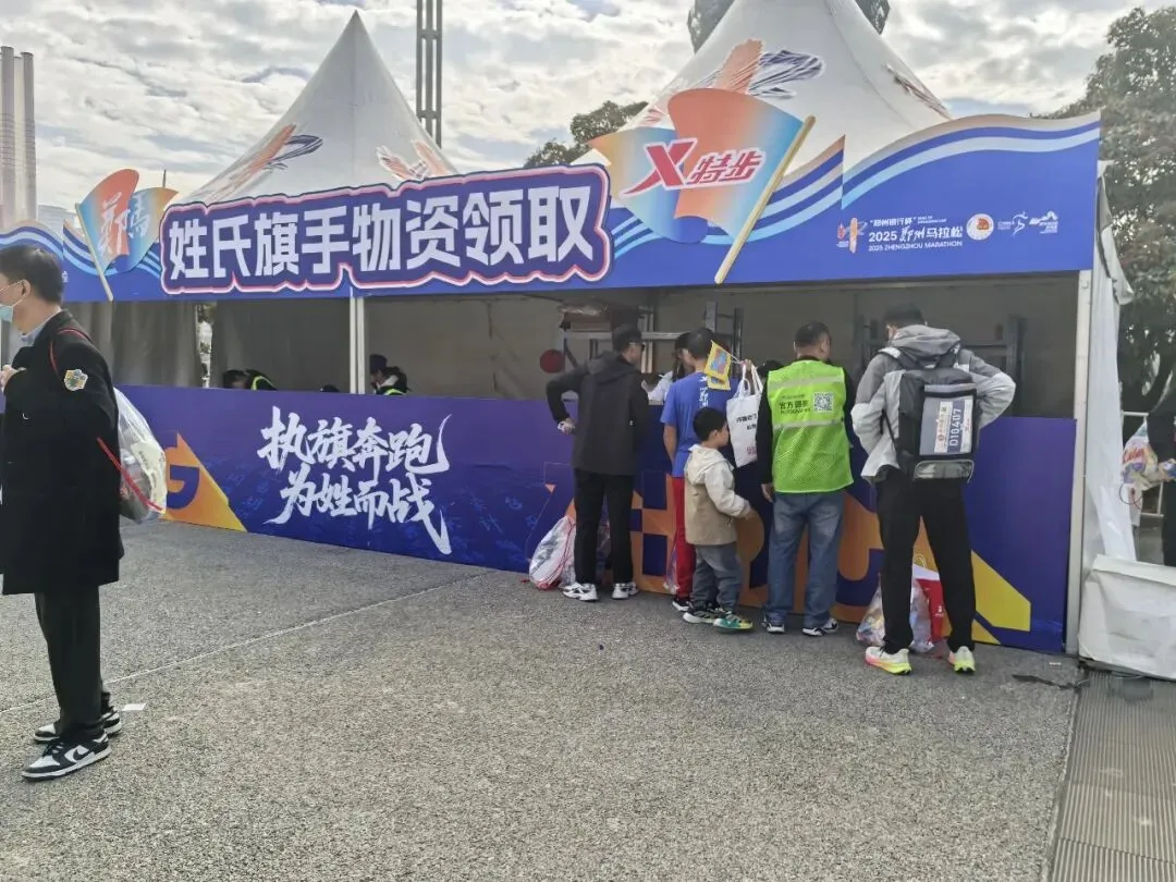 到达领物资地方(如意湖文化广场),领取小票,进去领物资,靠外测的方向有个别姓氏旗子,可惜【符】姓没上榜。在姓氏区域,从姓氏盒子里随机抓取一个【符】,打开看是五周年纪念图案。领完参赛物资,到外面周边溜达,看到姓氏旗手物资领取处,可惜没中签,不晓得以后有概率中么?姓氏柱这个玩法不错,大伙找自己的姓氏合影。郑马定妆照排长龙,果断放弃,后面看到跑者的成品照片,还是有些后悔,没坚持排队。