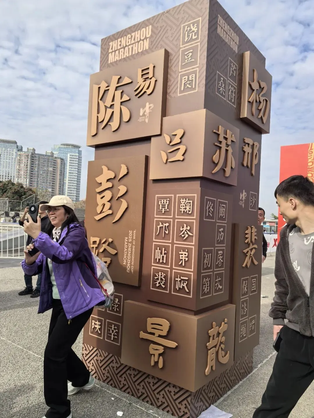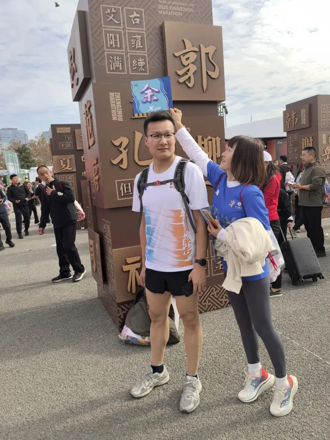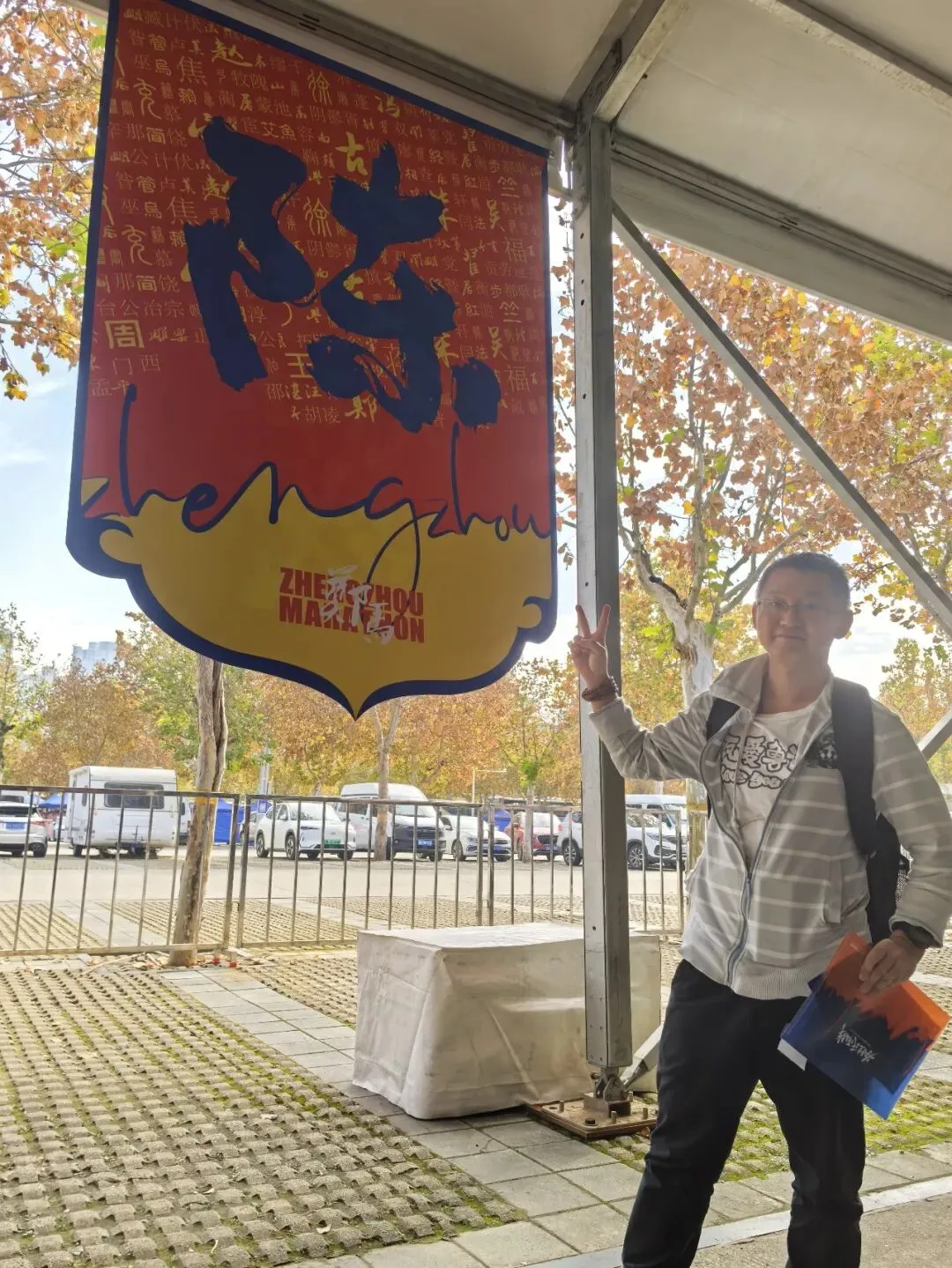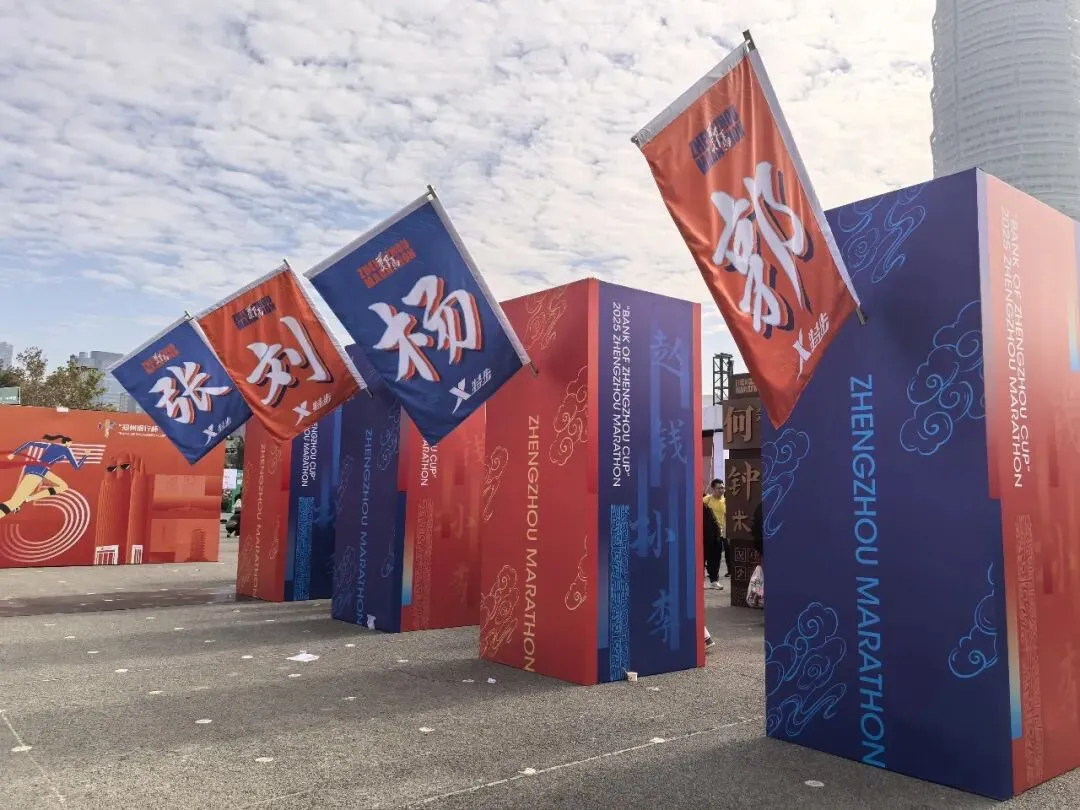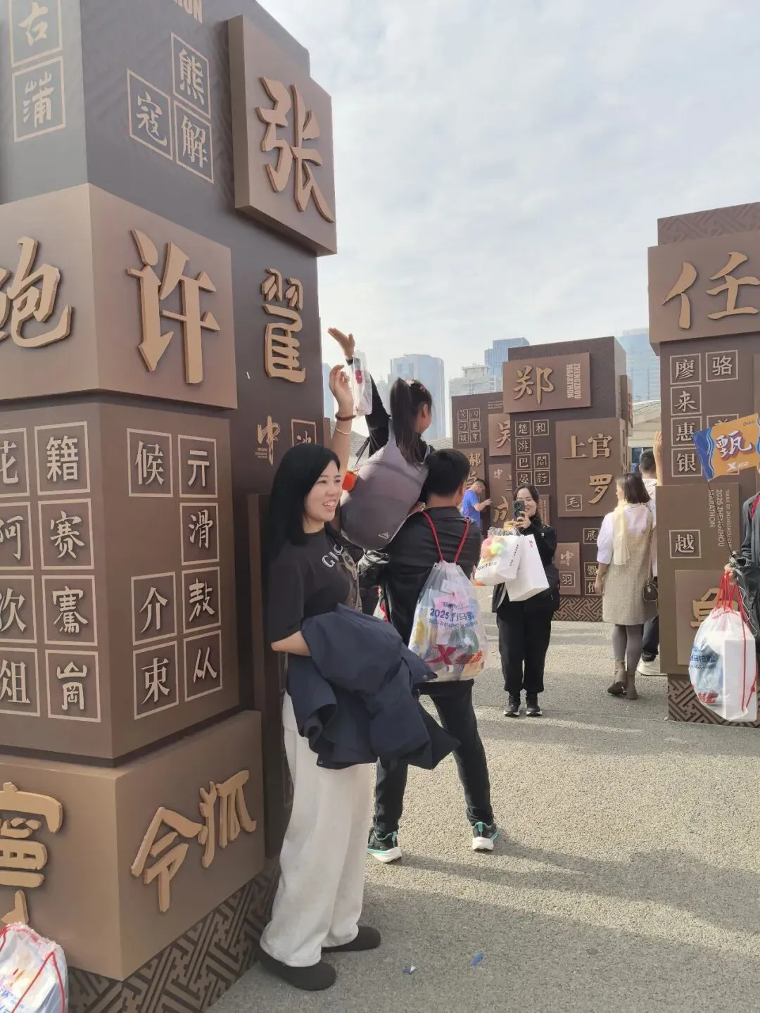 到达领物资地方(如意湖文化广场),领取小票,进去领物资,靠外测的方向有个别姓氏旗子,可惜【符】姓没上榜。在姓氏区域,从姓氏盒子里随机抓取一个【符】,打开看是五周年纪念图案。领完参赛物资,到外面周边溜达,看到姓氏旗手物资领取处,可惜没中签,不晓得以后有概率中么?姓氏柱这个玩法不错,大伙找自己的姓氏合影。郑马定妆照排长龙,果断放弃,后面看到跑者的成品照片,还是有些后悔,没坚持排队。
