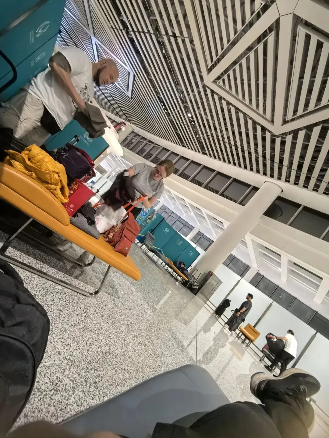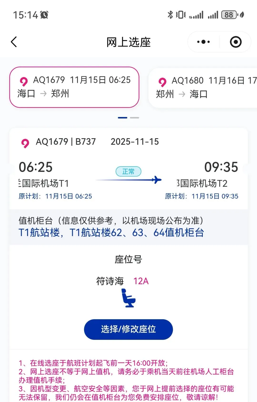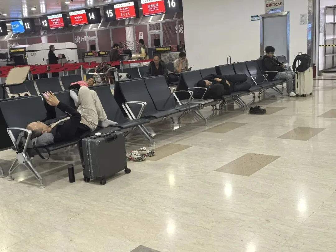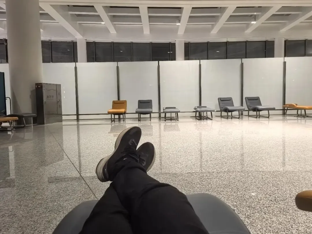 2025年11月15日凌晨03:47醒,在三楼出发大厅4号门外面等摆渡车,04:00没看到摆渡车,问工作人员,说去一楼到达大厅等,04:07坐摆渡车到T1到达大厅,坐电梯上二楼出发大厅,看到旅客在椅子上休息,这方式也不错。04:18找到人工柜台值机。04:30领取登机牌,04:36从A登机口进去,04:40安检。进来登机口,看到有个大沙发,在这里休息也挺好。先找个空闲位置充电,05:45登机,看航班信息,先到郑州,再飞赤峰。06:25起飞。