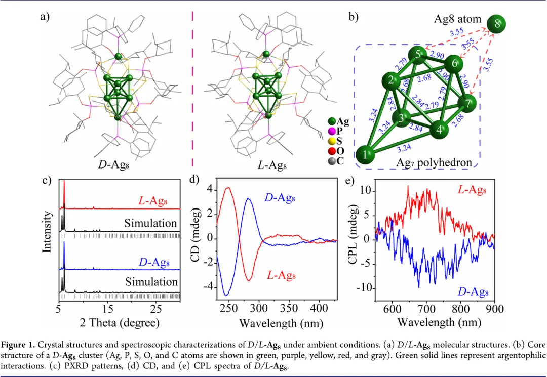 研究团队以 D/L-dtp(D/L-O,O'-二[2-异丙基-5-甲基环己基]二硫代磷酸)、三苯基膦(PPh₃)和三氟乙酸银(CF₃COOAg)为前驱体,在硼氢化钠还原条件下,于二氯甲烷和丙酮(体积比 1:1)的混合溶剂中合成了一对手性对映体银纳米团簇 D/L-Ag₈,其分子式为{[Ag₈H(D/L-dtp)₆(PPh₃)₂](CF₃COO)。电喷雾电离质谱测试证实了团簇中氢原子和三氟乙酸根阴离子的存在,单晶 X 射线衍射分析表明 D/L-Ag₈结晶于 R3 空间群,由两个 PPh₃配体和六个 D/L-dtp 配体共同保护,核心为纺锤形结构,包含一个七核银多面体(Ag₇)和一个独立银原子(Ag₈),初始状态下 Ag₈与相邻 Ag 原子的距离为 3.55 Å,长于银原子范德华半径之和(3.44 Å),无银亲银相互作用(图 1)。粉末 X 射线衍射图谱显示理论模拟与实验测量结果一致,证明 D/L-Ag₈结晶度良好;圆二色谱和圆偏振发光光谱证实了其手性光学信号,圆偏振发光不对称因子为 ±1.15×10⁻³,室温下表现为低质量红色发光,发射峰位于 660 nm,量子产率仅为 2.4%。