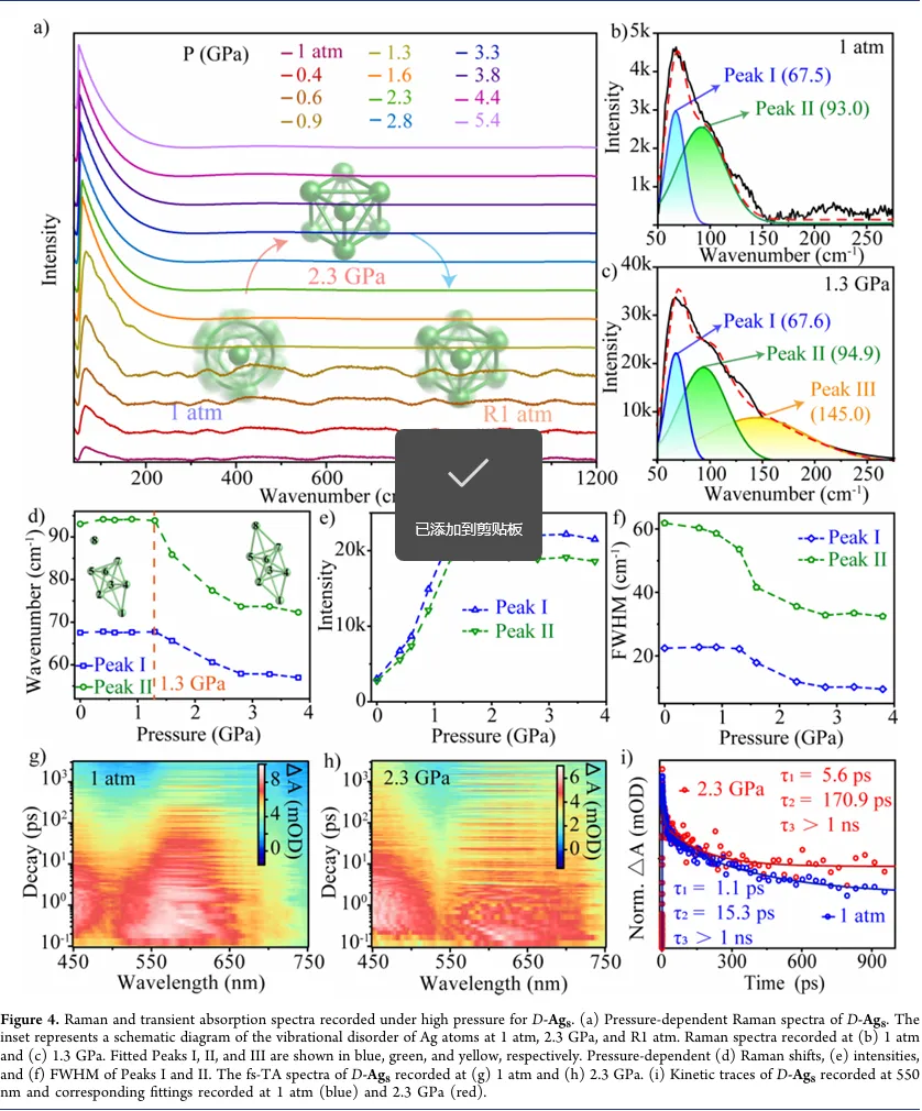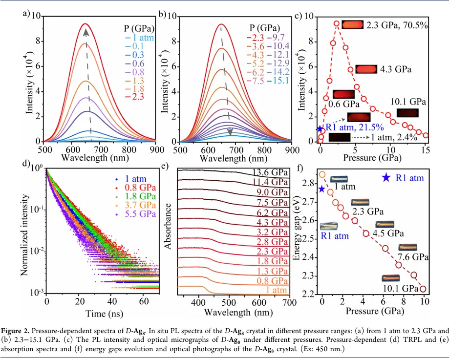 本研究成功合成了量子产率仅为 2.4% 的手性银纳米团簇 D/L-Ag₈,通过高压技术驱动团簇中银亲银相互作用的形成,实现了发光性能的显著提升,2.3 GPa 时量子产率最高可达 70.5%。压力完全释放后,新形成的银亲银相互作用阻碍了团簇结构恢复至初始状态,使量子产率稳定保持在 21.5%,成功捕获了高压亚稳态。原位高压结构分析、拉曼光谱和飞秒瞬态吸收光谱研究表明,压力增强的银亲银相互作用显著提高了 D/L-Ag₈的结构刚性,有效抑制了银原子的振动无序,减少了非辐射能量损失,进而大幅提升了光致发光效率。该研究突破了高压可逆性的限制,无需改变材料化学组成,为改善手性纳米团簇的发光性能、设计亚稳态结构提供了全新策略,同时也为高压技术在高性能手性材料合成中的应用开辟了新路径。