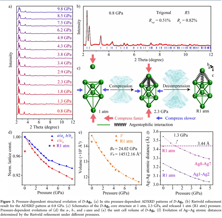 为揭示光学性能不可逆变化的结构根源,研究团队开展了原位高压同步辐射 X 射线衍射实验。压力依赖的角色散 X 射线衍射图谱显示,布拉格衍射峰随压力升高向高衍射角单调移动,表明晶格收缩,且无新峰出现,说明高压下未发生相变;压力释放后样品的衍射峰与初始状态相比发生显著位移,证实结构不可逆,同时衍射峰宽化、强度减弱,表明团簇结构部分非晶化(图 3)。Rietveld 精修结果显示,高压下 D-Ag₈的晶格参数(a、b、c 轴)和体积单调减小,体积弹性模量为 24.02 GPa,表现出良好的可压缩性,且晶格压缩具有各向异性,c 轴收缩速度快于 a、b 轴,这与 D-Ag₈沿 c 轴堆积更松散相关。银原子间距分析表明,高压下银原子间距呈现差异化收缩,其中 Ag₅-Ag₈、Ag₆-Ag₈和 Ag₇-Ag₈间距收缩更为显著,1.3 GPa 时达到 3.44 Å,形成新的银亲银相互作用,2.3 GPa 时核心结构变得高度致密且刚性增强;压力释放后,Ag₅-Ag₈、Ag₆-Ag₈和 Ag₇-Ag₈间距从 3.55 Å 显著减小至 3.43 Å,证实高压诱导的结构变化不可逆。基于 Hirshfeld 划分的独立梯度模型分析和银亲银结合能计算进一步证实,压力增强了 Ag₈与 Ag₇之间的银亲银相互作用,且这种增强作用在压力释放后仍能保留。