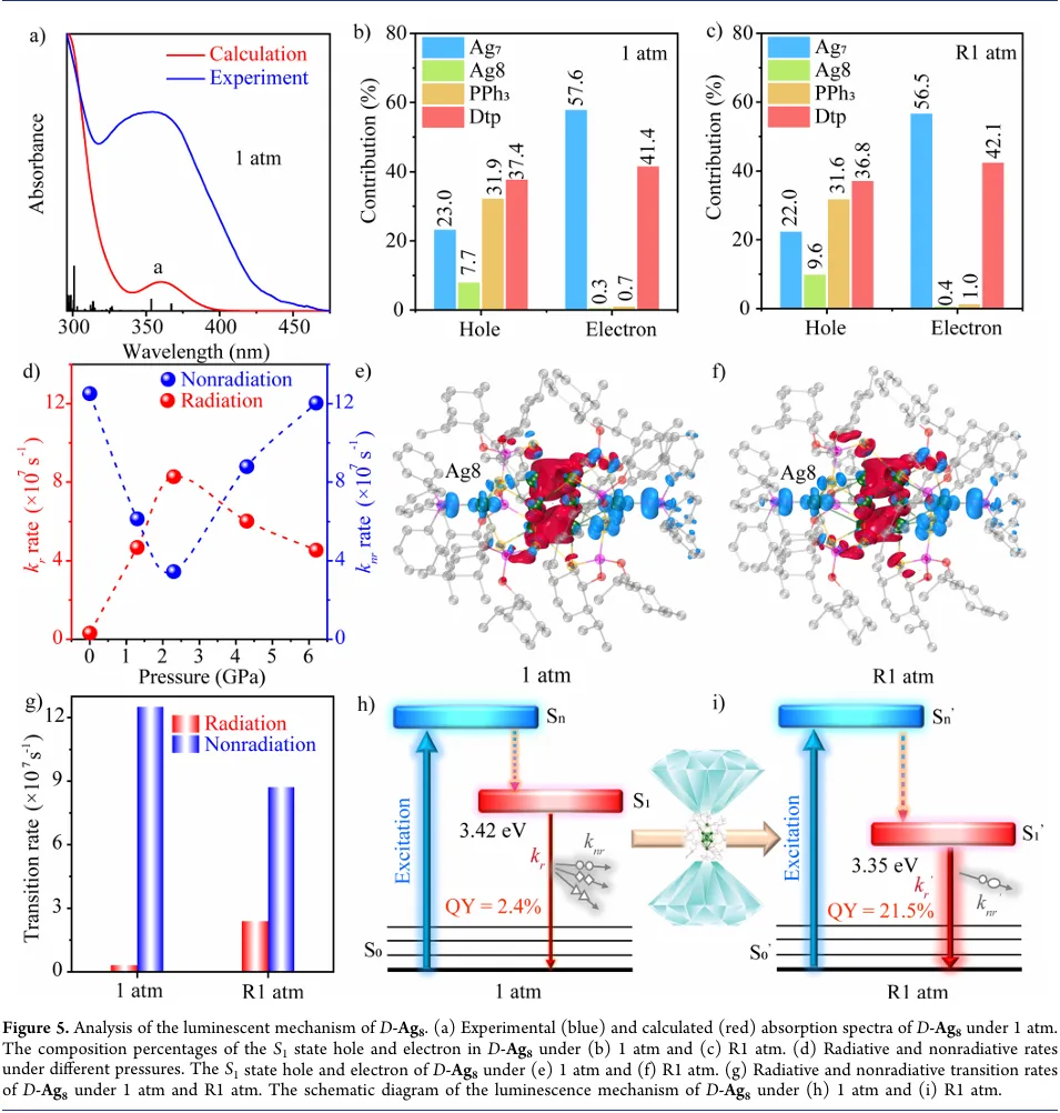 为深入探究高压下银亲银相互作用的演变及发光增强机制,研究团队进行了原位高压拉曼光谱和飞秒瞬态吸收光谱测试,并结合密度泛函理论计算。低波数区域(<300 cm⁻¹)的拉曼信号源于无机骨架的振动,1.3 GPa 以下拉曼峰轻微蓝移、强度显著增加、峰形逐渐尖锐,1.3 GPa 以上则出现异常显著红移,强度和峰形变化趋于平稳(图 4)。高斯-洛伦兹方程拟合和密度泛函理论计算表明,50-275 cm⁻¹ 范围内的拉曼峰可分解为两个峰,分别对应 Ag₈核心的摇摆振动和伸缩振动,高压下峰位、强度和半高宽的变化表明,压力诱导 Ag₈与 Ag₇形成新的银亲银相互作用,增强了核心结构的致密性和刚性,抑制了银原子的振动无序,且这些变化在压力释放后部分保留。飞秒瞬态吸收光谱显示,2.3 GPa 时最高激发态(Sₙ)到第一激发态(S₁)的内转换寿命从 1.1 ps 增至 5.6 ps,S₁态的结构弛豫寿命从 15.3 ps 显著延长至 170.9 ps,表明压力增强的银亲银相互作用有效抑制了弛豫路径。时间依赖密度泛函理论计算表明,D-Ag₈的发光源于配体到金属和金属到金属的电荷转移,高压下银原子轨道对最高占据分子轨道的贡献增加,电荷分布发生变化;辐射衰减速率(kᵣ)和非辐射衰减速率(kₙᵣ)计算显示,2.3 GPa 时 kᵣ较初始值提升 26.7 倍,kₙᵣ显著降低,压力释放后 kᵣ仍保持较高水平,kₙᵣ持续受抑,证实结构刚性增强和振动无序抑制是发光效率提升的关键(图 5)。此外,稳定性测试表明高压亚稳态 D-Ag₈在室温下可稳定储存至少一个月,研究团队还利用 Kawai 型大体积压机制备了体相 D/L-Ag₈,成功开发了红色圆偏振发光二极管器件,并将其应用于信息加密领域,实现了微观二维码和大学标志的高分辨率图案制备及信息存储与解密。