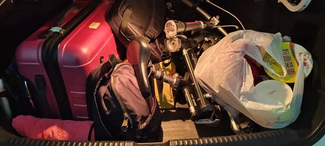 担心春节期间饭店不营业,带的各种方便食品;专门购买的自驾应急包:电动气泵,防滑链,补胎钉,拖车绳。