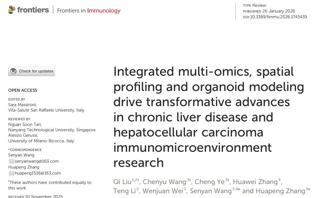 2026年2月,郑州大学第一附属医院团队在期刊《Frontiers in Immunology》(IF:5.9)在线发表题为:Integrated multi-omics, spatial profiling and organoid modeling drive transformative advances in chronic liver disease and hepatocellular carcinoma immunomicroenvironment research的高水平研究论文。