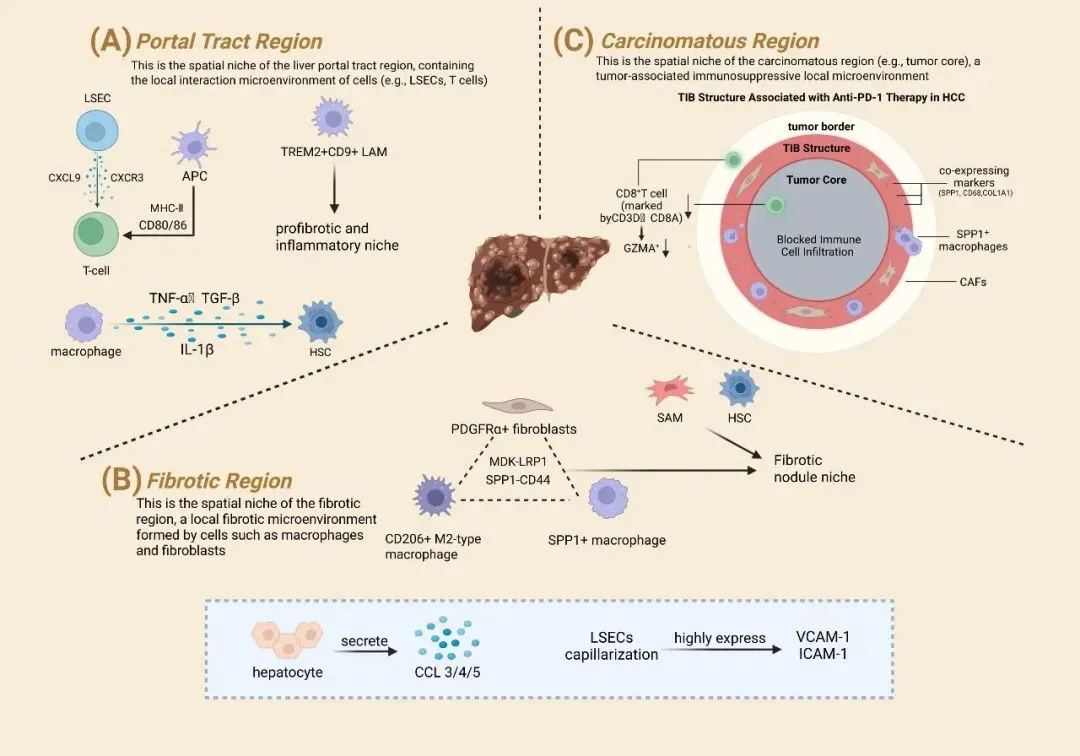 3. 通过空间转录组学精确定位门脉区、纤维化间隔和癌灶区域的三维免疫微环境特征,发现肿瘤免疫屏障结构是肝癌免疫治疗耐药的关键空间机制。