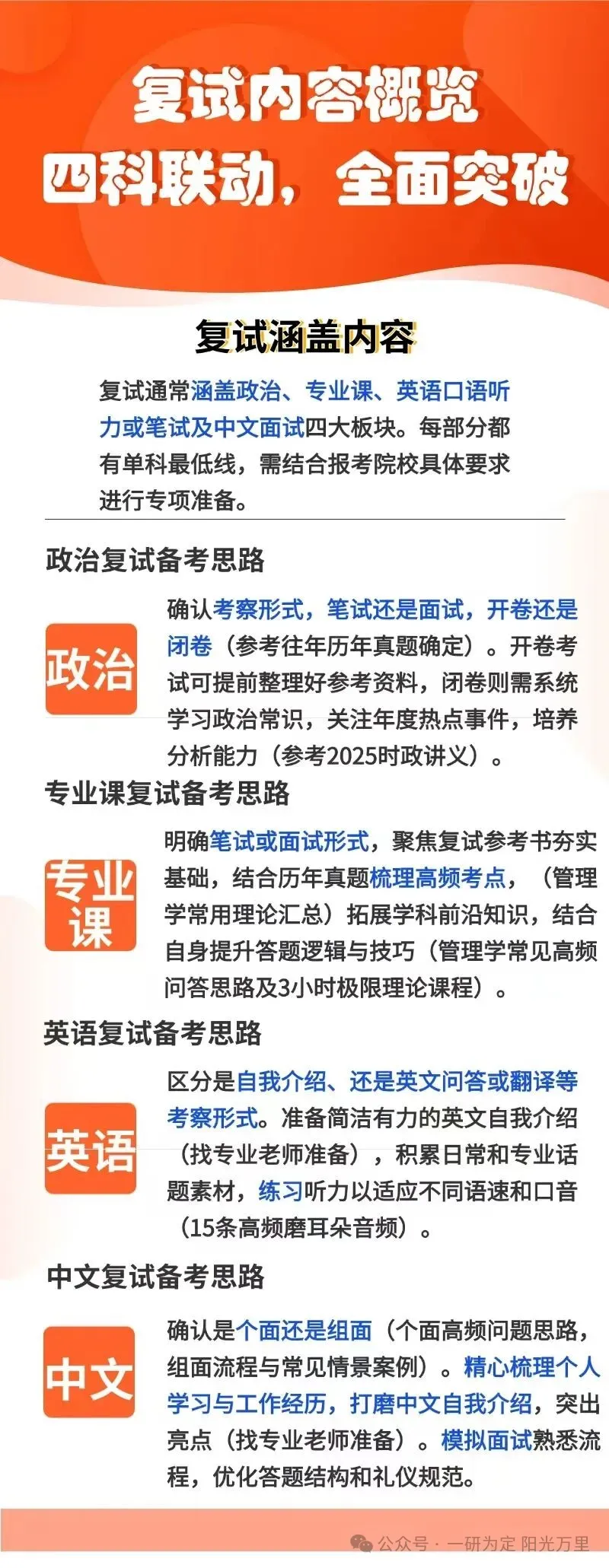 复试内容主要包括思想政治品德、专业知识和能力、英语能力以及综合素质。