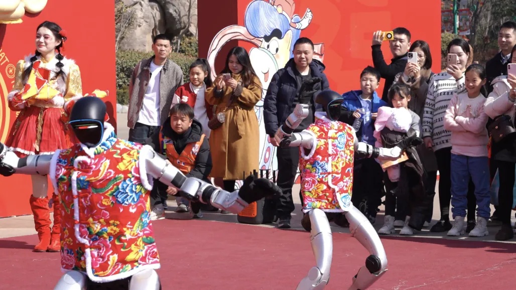 在银基动物王国,中国结、生肖造型灯饰等新春美陈与毛绒动物气模装点各处,欢快的音乐与游客的欢笑声交织在一起。除了白虎、小熊猫、卡皮巴拉等明星动物的花式拜年,游客还能欣赏到气势十足的骑马巡游和悠扬的马头琴演奏。今年最出人意料的节目,当属机器人拜年舞蹈——它们与秧歌演员同框共舞,《大花轿》《快乐崇拜》等耳熟能详的曲目配合机械而又灵动的动作,引来游客阵阵喝彩。园区特邀的高颜值NPC穿梭在人群中,与游客合影互动,成为社交平台上的热门打卡元素。