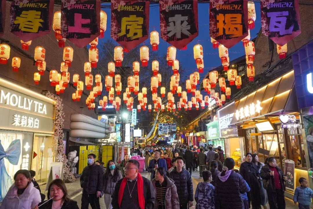 这个春节,郑州特色街区场景新意迭出:阜民里的新春灯会流光溢彩,年味满满;二七米房时尚创意街区的新春照相馆免费为市民、游客拍摄新春全家福,定格美好;亳都·新象的沉浸式戏剧妙趣登场,精彩十足……“趁着假期,我带着家人来这个网红打卡地逛逛。这里真时尚、真热闹啊!”大年初五,市民王笑盈漫步在亳都·新象,发出由衷的感慨。这个假期,像王笑盈一样走进绿城特色商业街区、感受新春氛围的市民众多。据统计,春节期间,郑州重点建设的19条特色商业街总客流量达982.72万人次,同比增长19.81%,总营业额达5.48亿元,同比增长17.06%。