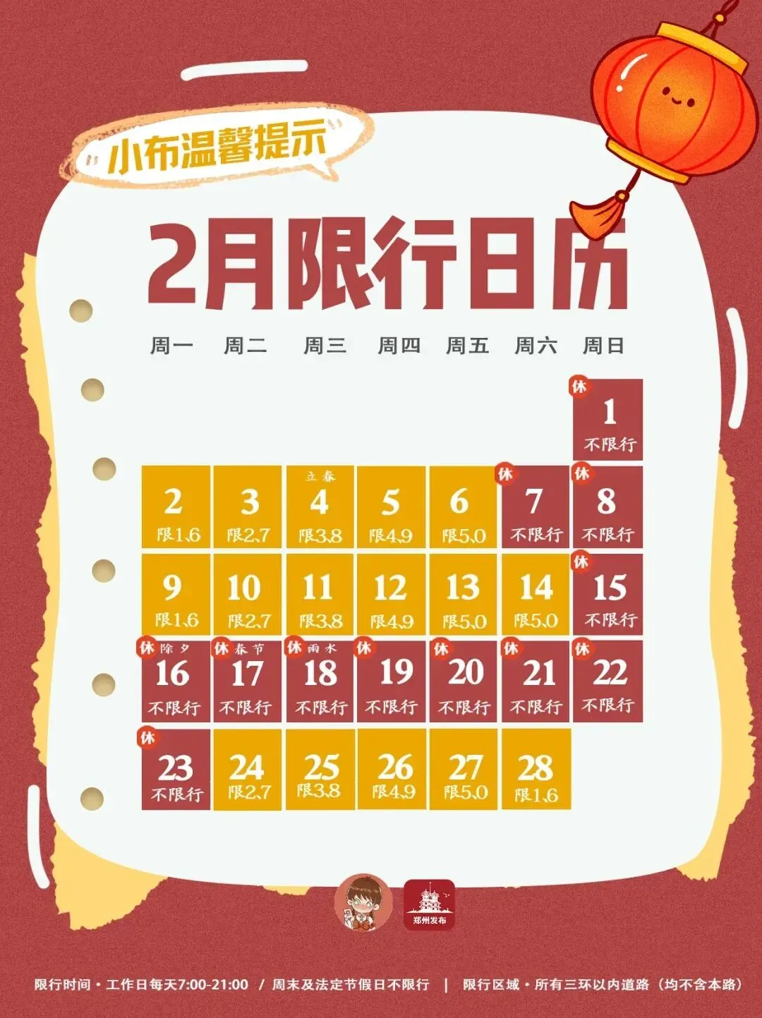 2月23日(本周一)为春节假期期间,郑州暂缓实施尾号限行规定;