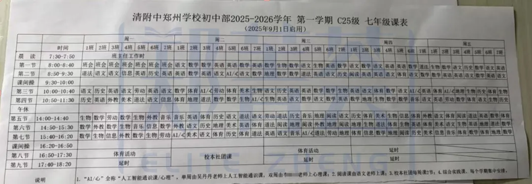 清华附中七年级课表