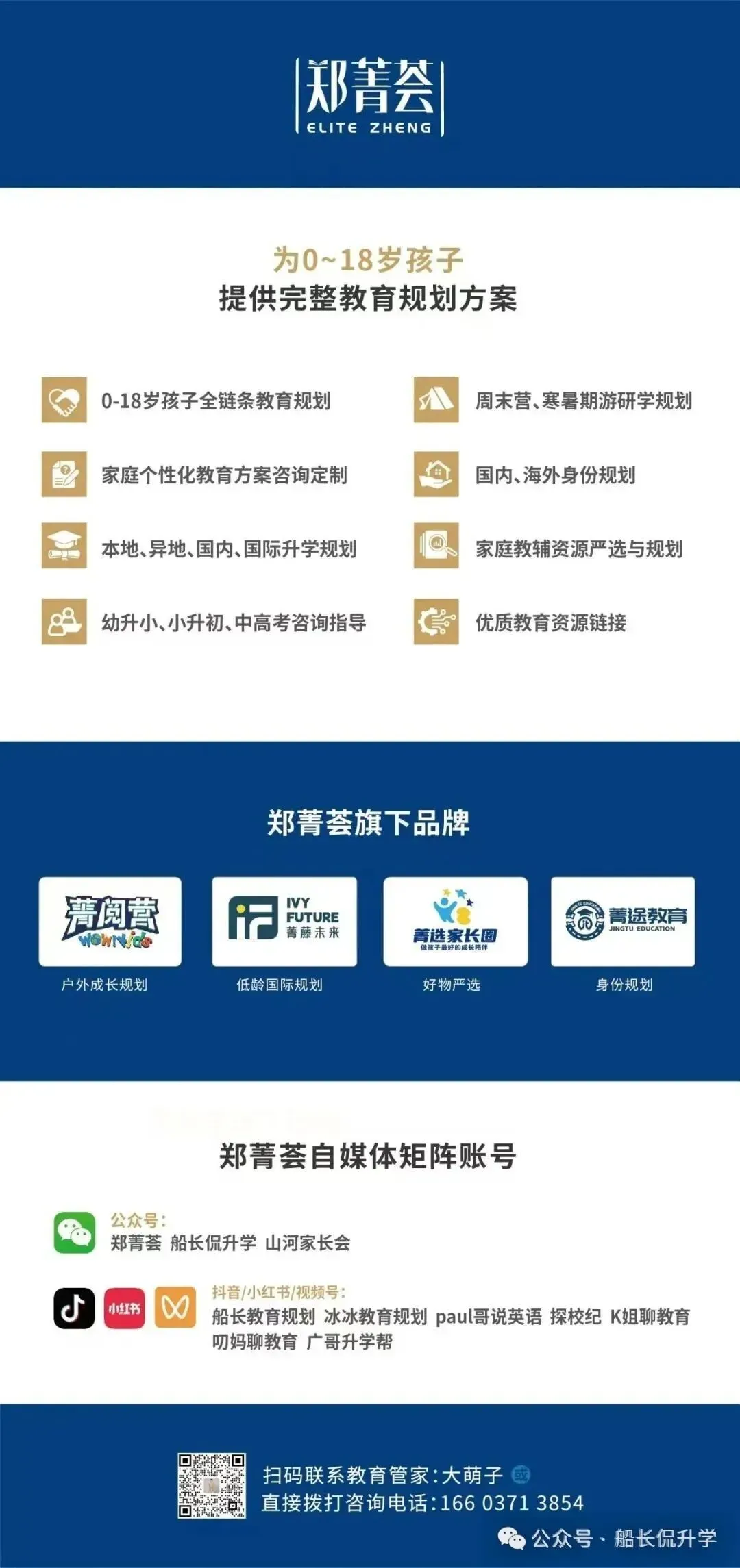 幼升小、小升初、学科规划、异地升学、家庭辅助、香港身份、出国留学……关于教育的任何问题,都可以扫描下图中的二维码,添加教育管家微信进行咨询。