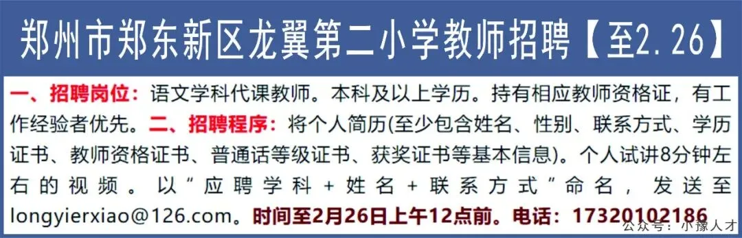 >郑州市郑东新区龙翼第二小学教师招聘【至2.26】