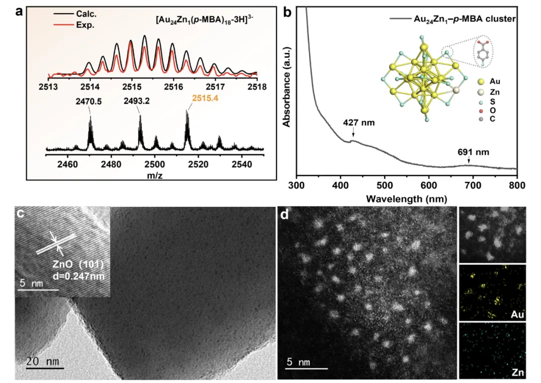 图 1. (a) Au₂₄Zn₁−p-MBA 团簇的电喷雾电离质谱(负离子模式)。插图中的黑色线代表 [Au₂₄Zn₁(p-MBA)₁₈−3H]³⁻的模拟同位素分布。(b) Au₂₄Zn₁−p-MBA 团簇的紫外 - 可见吸收光谱。插图展示了 Au₂₄Zn₁−p-MBA 团簇的结构示意图,其中p-MBA 配体仅用 S 原子表示。(c) Au₂₄Zn₁/ZnO 的透射电镜(TEM)图像;插图显示了 ZnO 的晶格条纹。(d) 从 Au₂₄Zn₁/ZnO 上剥离的 Au₂₄Zn₁团簇的高角环形暗场(HAADF)像和能谱(EDX)元素分布图。