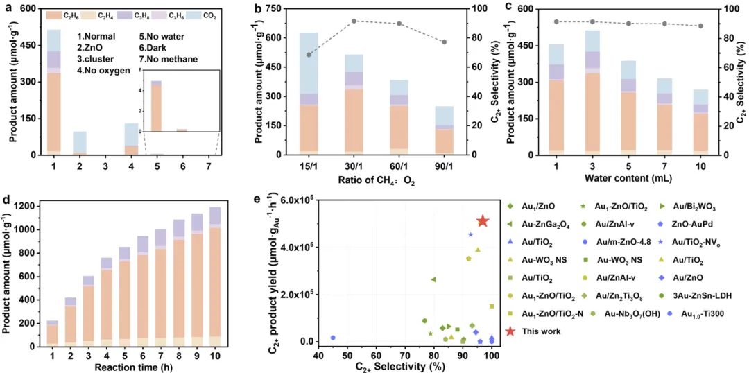 图 2. (a) Au₂₄Zn₁/ZnO 催化剂在不同反应条件下的催化性能。Au₂₄Zn₁/ZnO 催化剂的性能:(b) 不同 CH₄/O₂比例下的催化活性;(c) 直径 2.9 cm 反应釜中不同水含量下的催化活性;(d) 直径 3.6 cm 反应釜中 C₂₊产物收率随反应时间的变化。反应条件:催化剂用量 10 mg,反应气 CH₄/O₂=30/1,去离子水 3 mL,氙灯功率 300 W。(e) 已报道催化剂在 CH₄光催化偶联反应中的活性与选择性对比。蓝色符号代表甲烷非氧化偶联反应,绿色符号代表间歇式反应釜中甲烷氧化偶联反应,黄色符号代表流动式反应釜中甲烷氧化偶联反应。