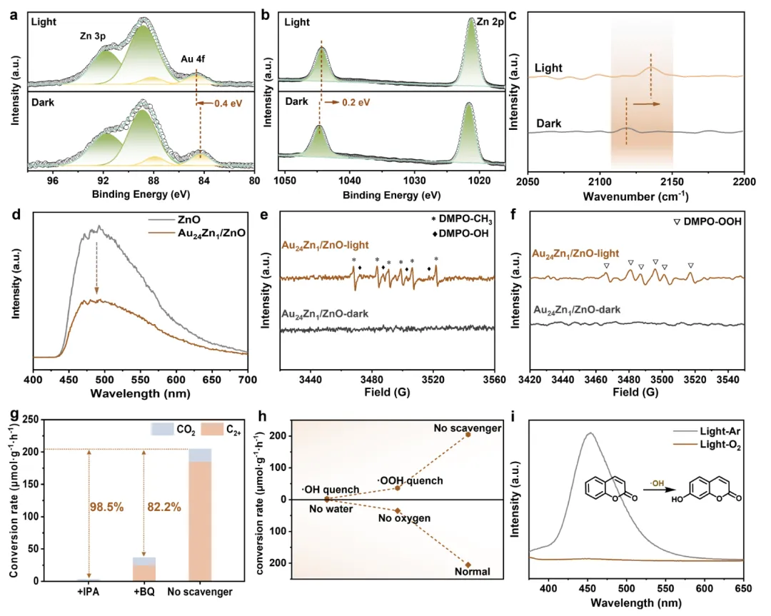 图 3. Au₂₄Zn₁/ZnO 催化剂在黑暗和光照条件下的 XPS 谱图:(a) Au 4f 区域,(b) Zn 2p 区域。(c) Au₂₄Zn₁/ZnO 催化剂在光照和黑暗条件下的 CO–DRIFT 谱图。(d) Au₂₄Zn₁/ZnO 与 ZnO 的稳态光致发光(PL)谱图。以 DMPO 为自由基捕获剂,在 Au₂₄Zn₁/ZnO 催化剂上进行电子顺磁共振(EPR)捕获实验,以监测 (e)・OH、・CH₃和 (f)・OOH 活性物种的生成。(g) Au₂₄Zn₁/ZnO 体系中活性氧物种(ROS)的淬灭实验。(h)・OOH 与・OH 自由基的淬灭实验对比,以及无氧或无水条件下的对照实验。(i) 在 Ar 和 O₂氛围下,以香豆素为捕获剂,通过荧光探针法对・OH 自由基进行的原位捕获实验。插图中的化学反应是香豆素检测・OH 的机理。