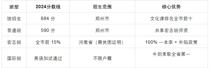 国宏班一本率常年100%,985/211 录取率超 50%,2025 年平均分超一本线 130+;普高整体一本率 75%+,2026 年录取线预测 678–680 分,稳居郑州前十。同时开设中新友好实验班、中美国际班、中澳国际班,国际升学通道成熟,适配多元升学需求;初中部西少班(少年班培养路径)也为高中输送优质生源。