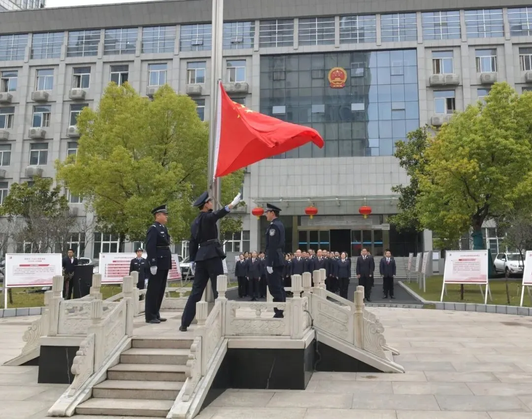 伴随着雄壮激昂的《义勇军进行曲》,鲜艳的五星红旗冉冉升起。全体干警面向国旗行注目礼,深切抒发对祖国母亲的无限热爱,凝聚起忠诚履职、担当作为的奋进力量。
