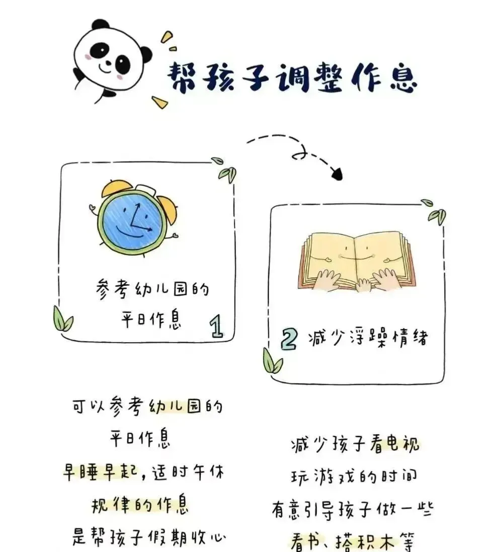 • 午餐、午睡时间尽量和幼儿园同步,减少开学后“倒时差”的不适。