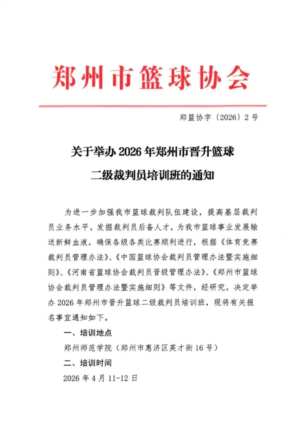 >裁判培训 | 关于举办2026年郑州市晋升篮球二级裁判员培训班的通知