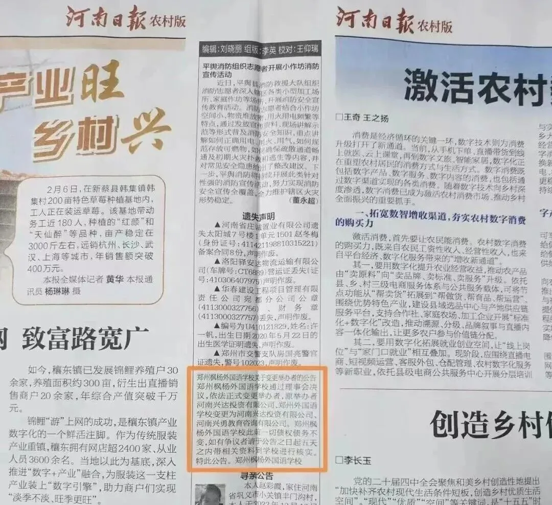 消息来源是在年前,2月9日,郑州枫杨外国语学校(西枫杨)在《河南日报》(农村版)刊发公告:正式变更举办者。原举办者河南兴达投资有限公司、郑州外国语学校变更为河南兴达投资有限公司、河南兴勇教育咨询有限公司。
