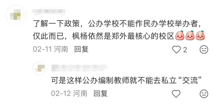 此外,还有消息称,此次变动只是因为政策要求,公办学校不能作民办学校举办者,枫杨依然是郑外最核心的校区。
