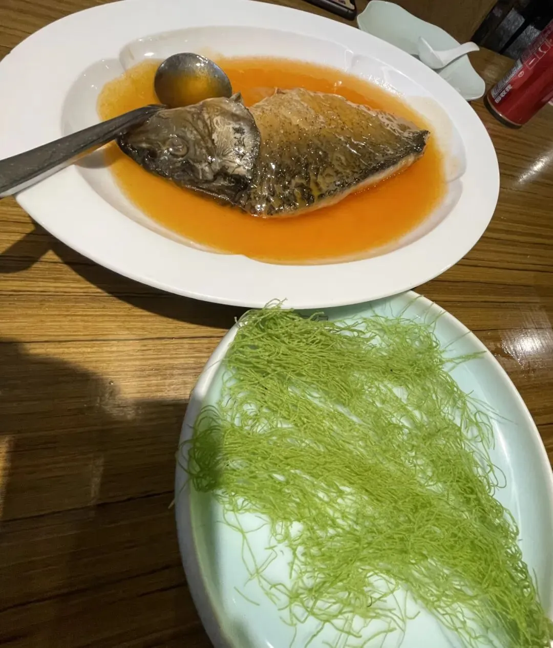 我要点菜,必须点当地特色,有一道招牌菜是“鲤鱼焙面”。菜上来人也是醉了。咱以为的面是像陕西大盘鸡拌面里的面,要一份他爷俩不吃鱼还能吃面,可…