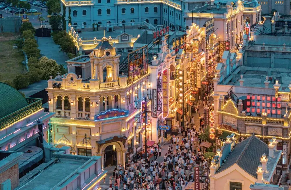 航拍郑州建业电影小镇夜景